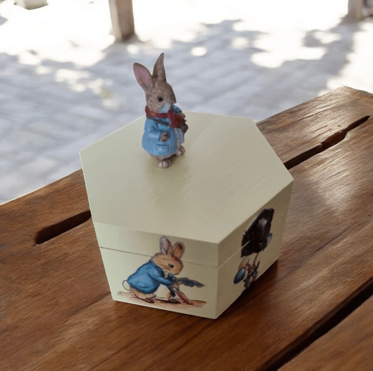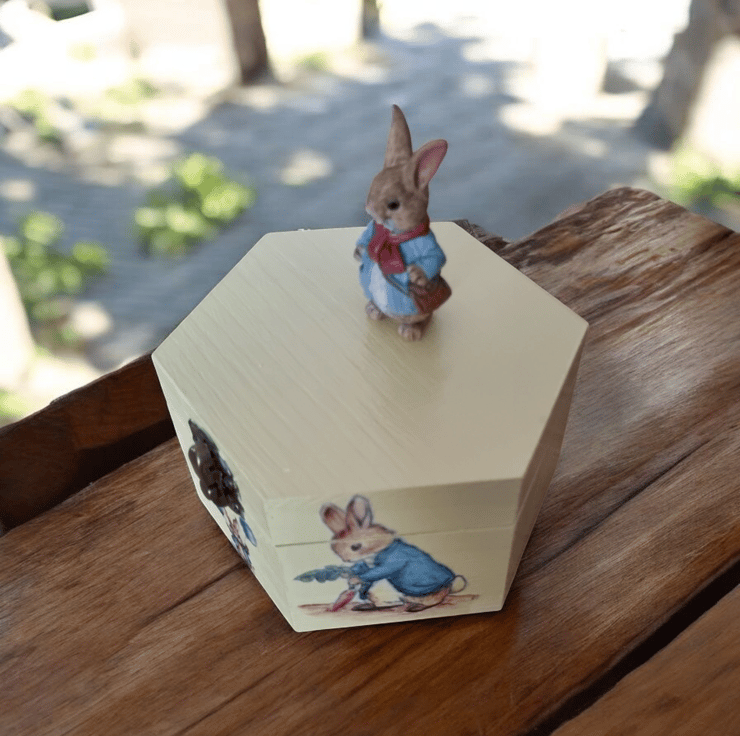 This is a hand painted and varnished wooden box which has been lovingly decoupaged with bunny rabbits to the front and sides.