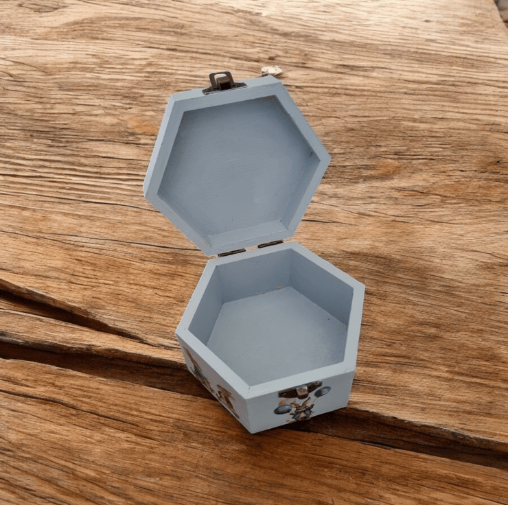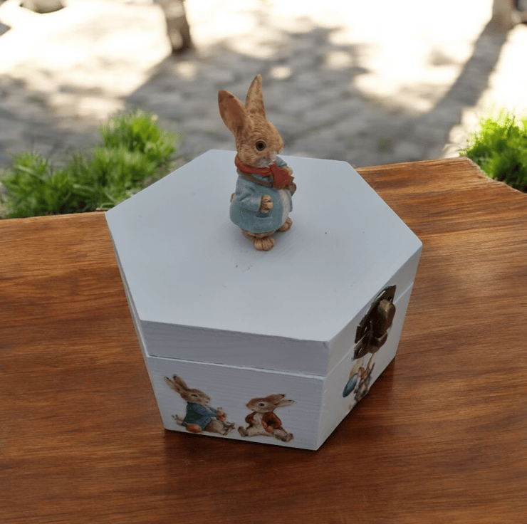 This is a hand painted and varnished wooden box which has been lovingly decoupaged with bunny rabbits to the front and sides.