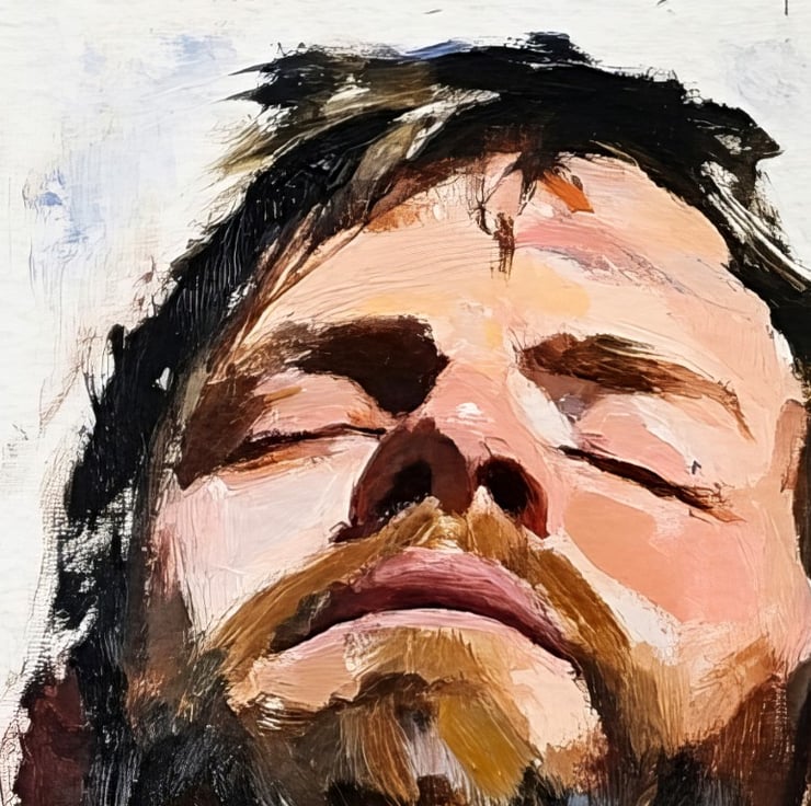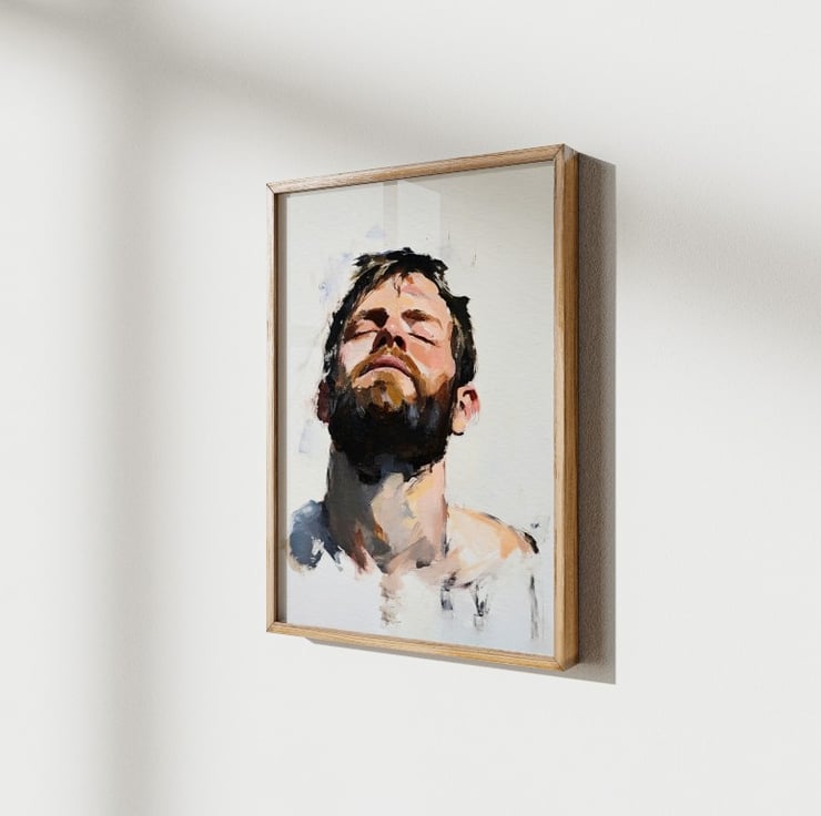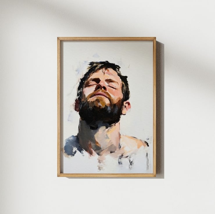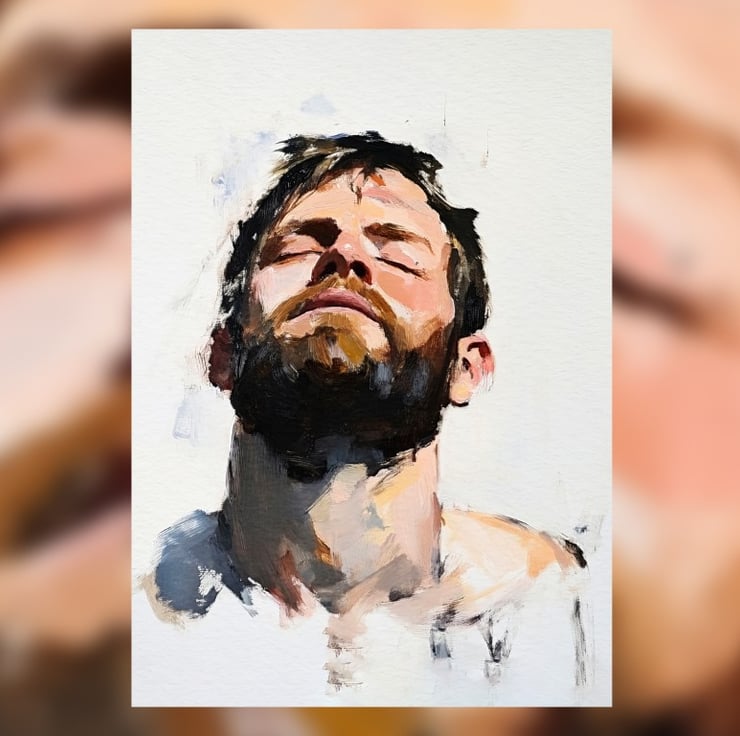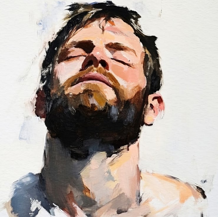 This emotive portrait captures raw emotion through bold, expressive brushstrokes. The bearded man tilts his head back with his eyes closed, evoking a powerful sense of introspection. The contrast between deep shadows and warm skin tones enhances the painting’s depth, drawing the viewer into the subject’s emotional state.