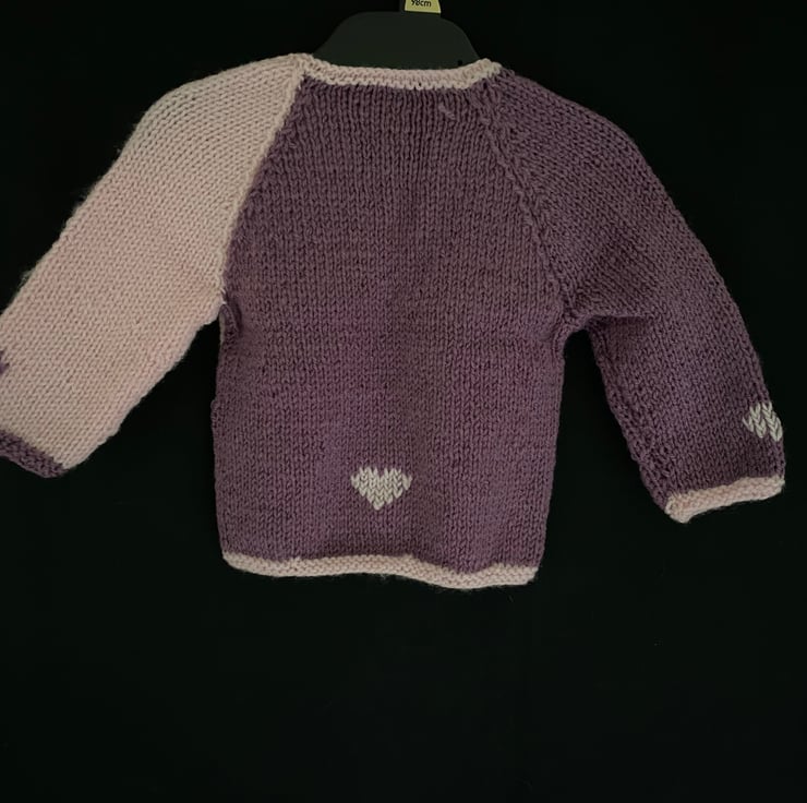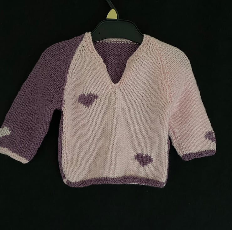 Pink/purple open neck jumper with pink front & purple heart. Reverse colours on the back (purple with pink heart). To fit age 6-12 months.