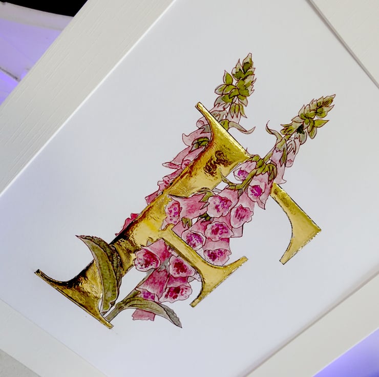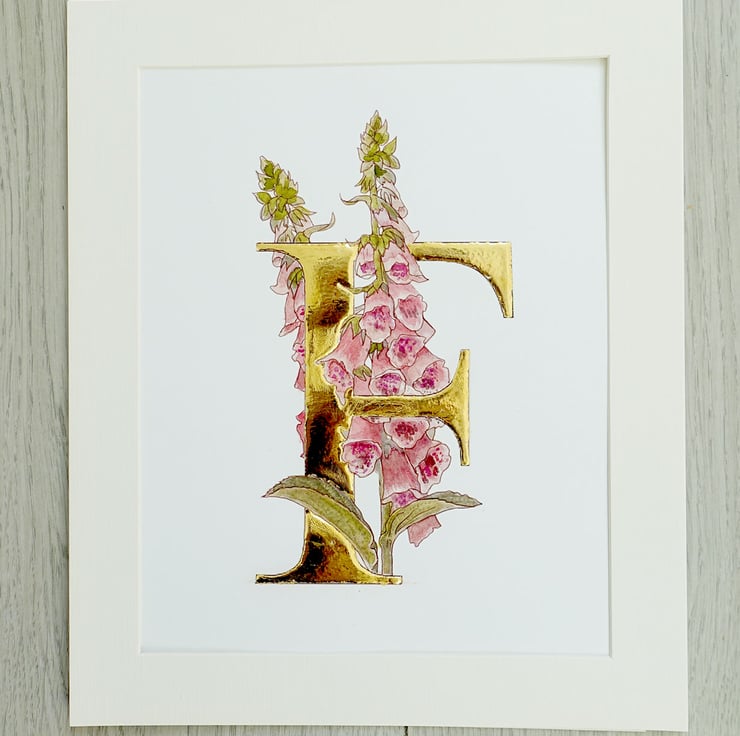 Original watercolour art of cerise and pink foxgloves with a large letter F in 23.5 gold carat leaf. Size is A4 on 300gsm watercolour paper.
