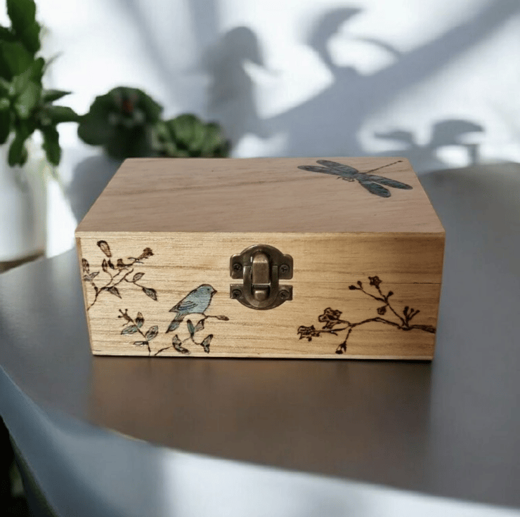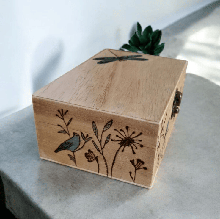 I have used pyrography to the front and sides and added a dragonfly to the top.