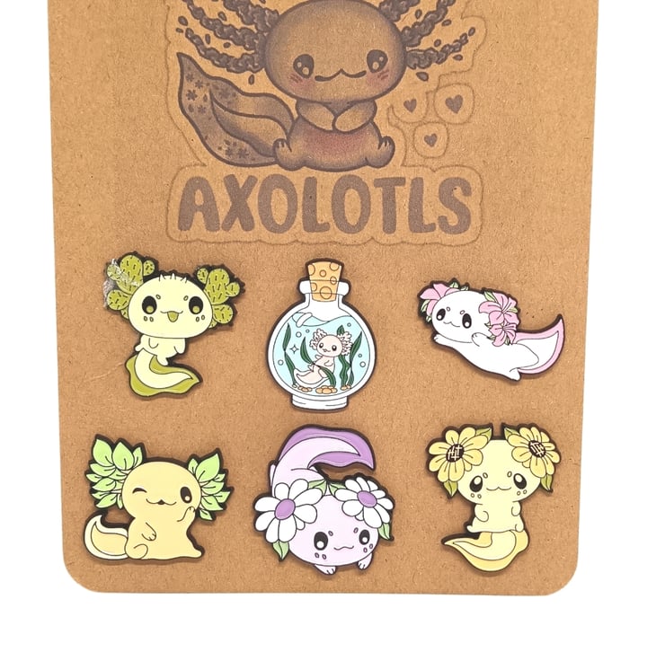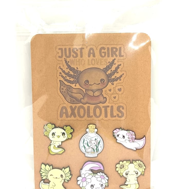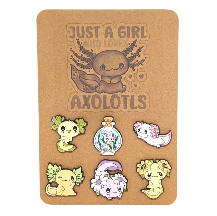Six Axolotl Enamel Pin Badge Brooches, each measuring approximately 3 cm by 3 cm.