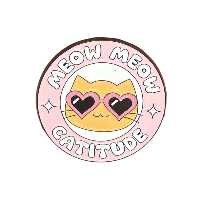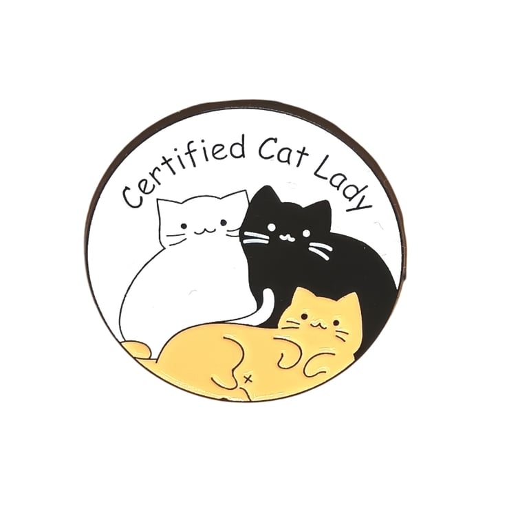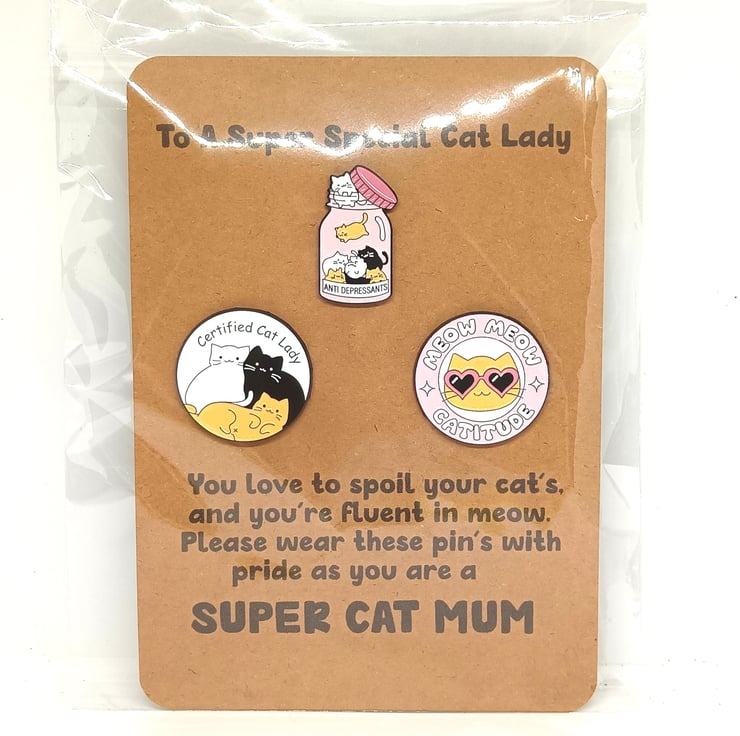 set of three super cat mum Enamel Pin Badge Brooches, each measuring approximately 3cm by 3cm.