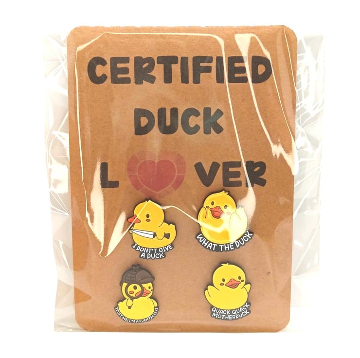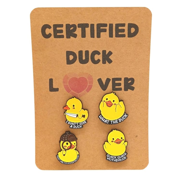 set of four duck lover Enamel Pin Badge Brooches, each measuring approximately 3cm by 3cm.