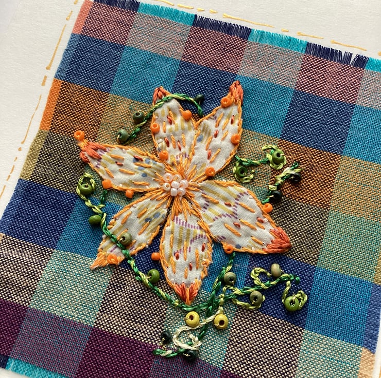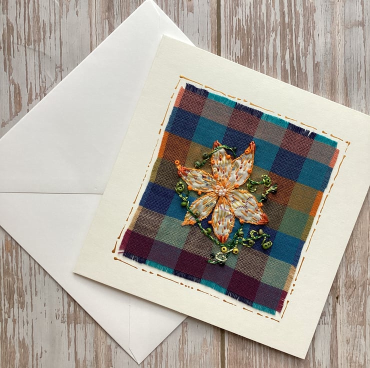 This handcrafted card features intricate hand embroidery on a vibrant plaid fabric. Whether you are sending a heartfelt greeting, a thoughtful note or simply a little piece of handmade artistry to someone special, this card is perfect for any occasion.
