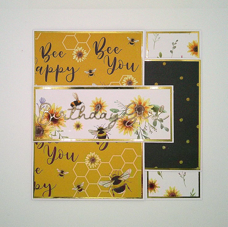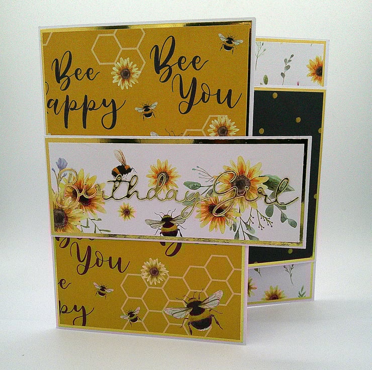 Handmade triple flap card in a stylish and beautiful bee theme. This card has been made using a variety of complimentary design papers and gold foiled card. A lovely dimensional card, perfect for wishing someone special a hap-bee-birthday. (sorry)
