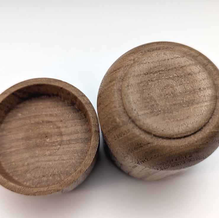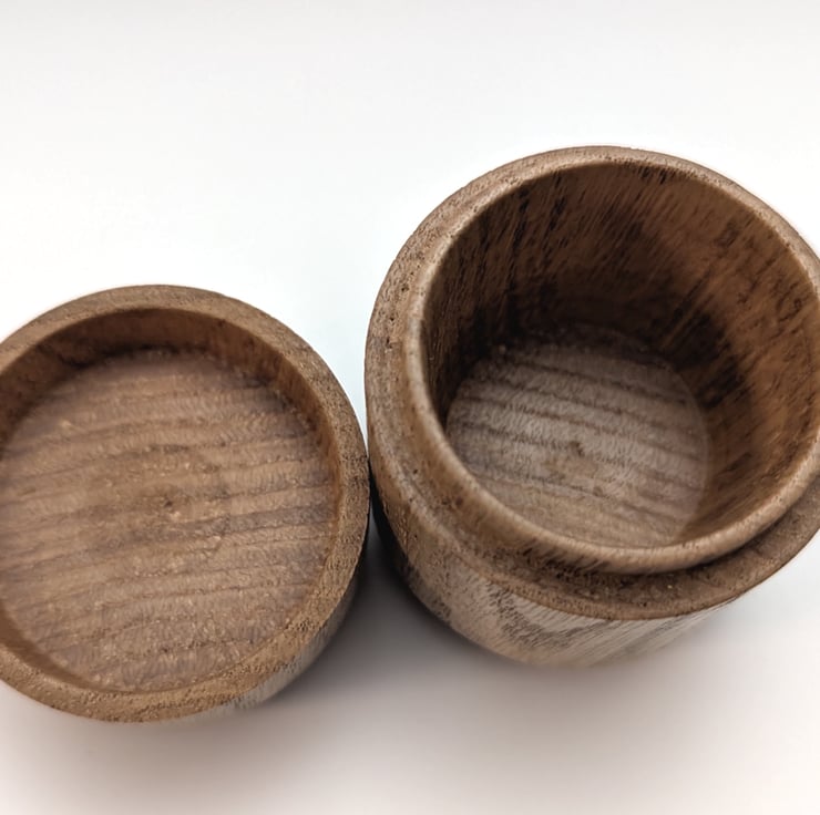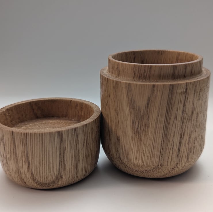 This is a small oak hand-turned box (a lidded container). The lid is a loose fit with a good weight. The box has rounded top and bottom, but sits nice and flat and is very stable.