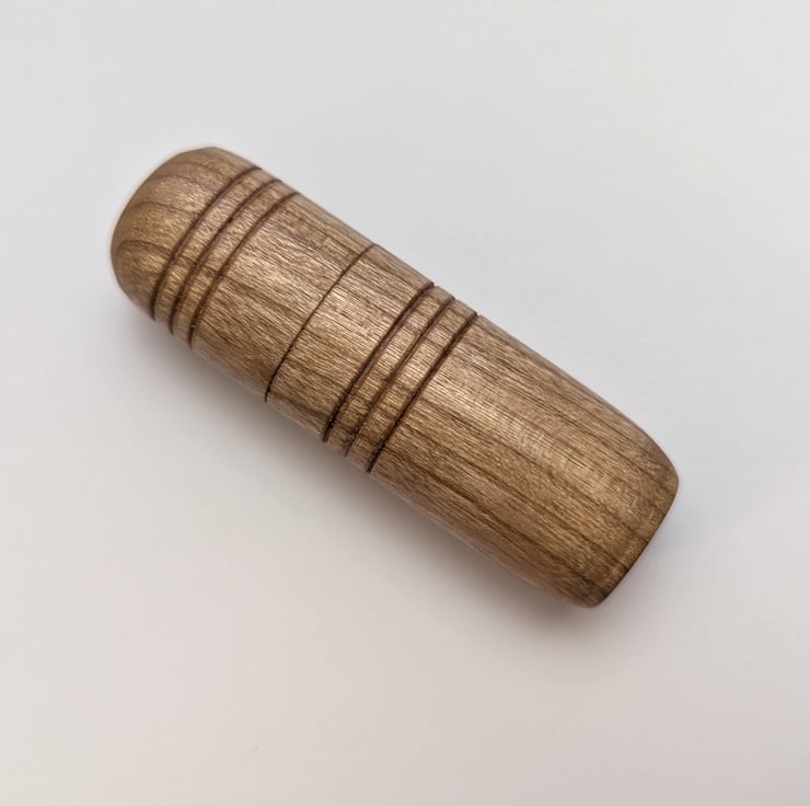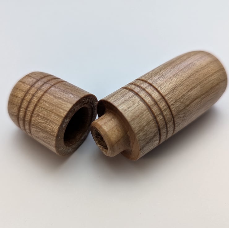 This is a small, hand-turned maple needle case. The lid is a suction fit (won't fall off). The depth of the case is 28mm, with an internal diameter of about 7mm. The entire case is 65mm in length and around 18mm in diameter.