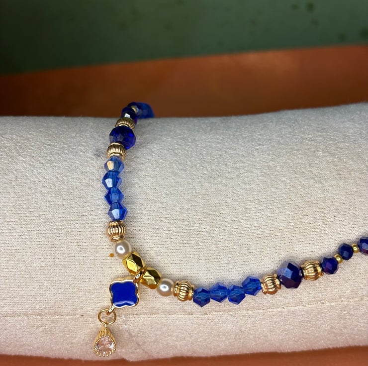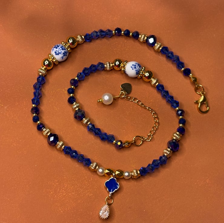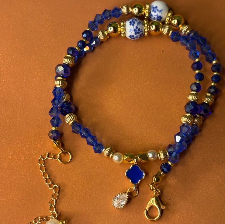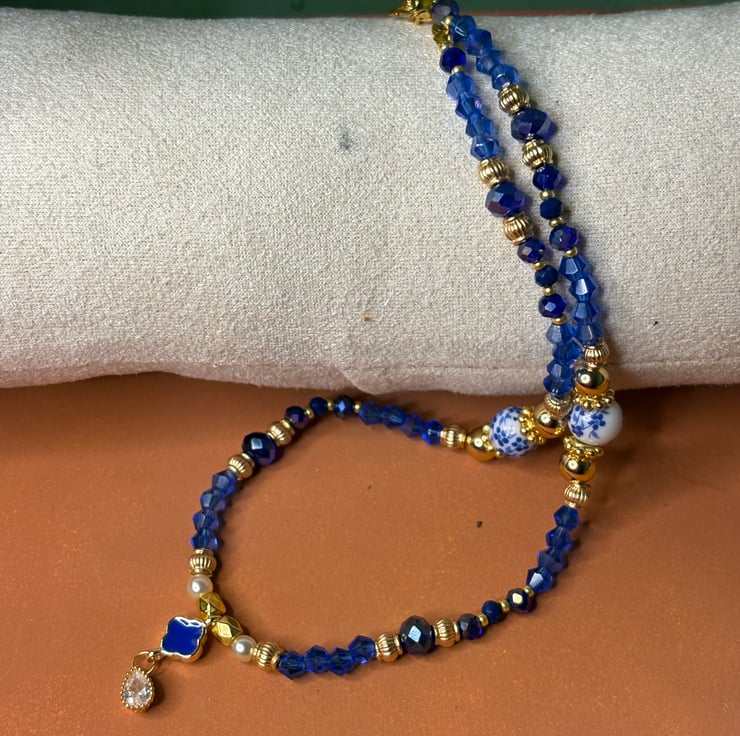 Handcrafted with faceted blue crystals, golden beads, pearls, and ornate porcelain beads, each element is a nod to the timeless beauty of Spanish craftsmanship. A gold-plated charm with a sparkling crystal adds a touch of sophistication, making this piece both elegant and versatile.