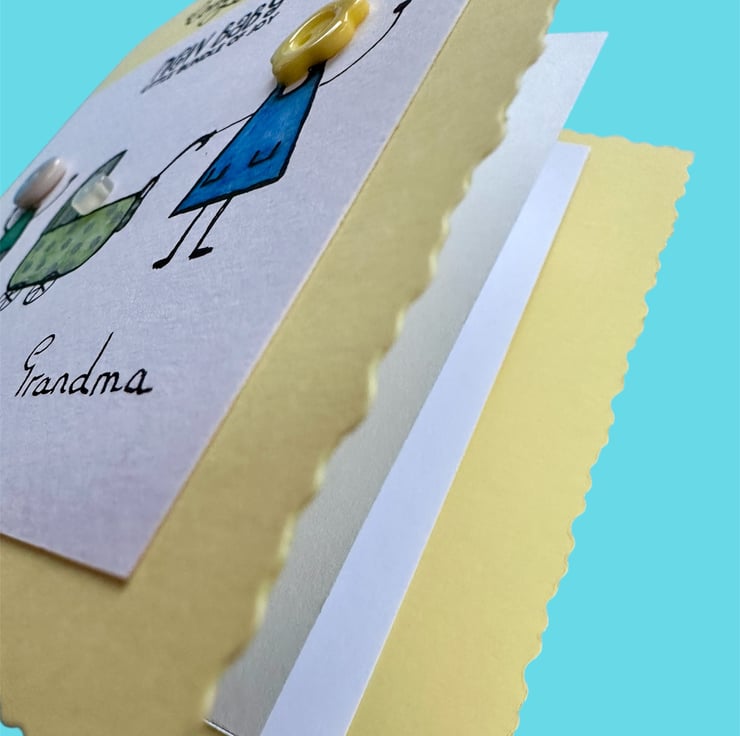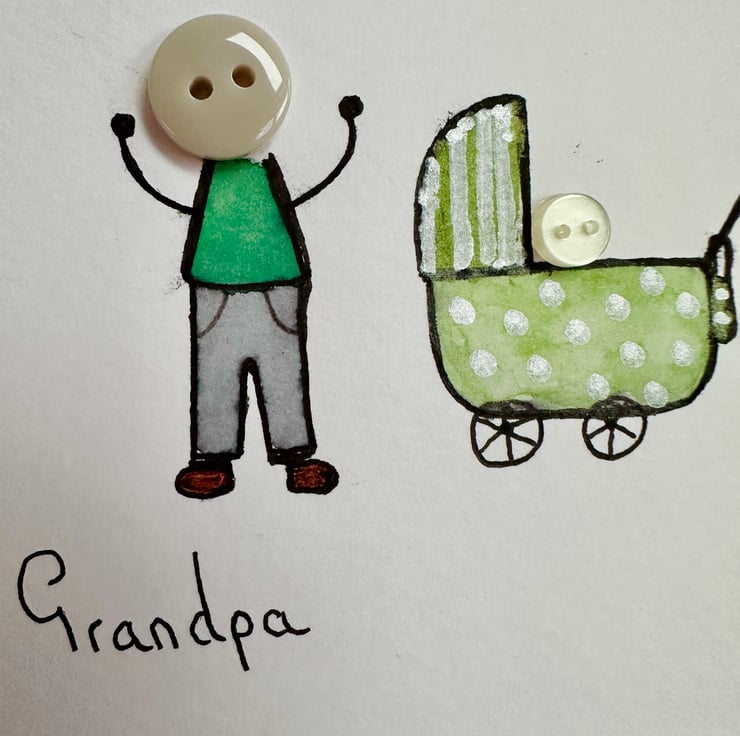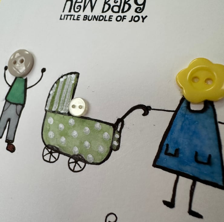 Each card is hand drawn then painted with watercolours with a touch of metallic shimmer, and given little button heads on a thick white card stock with the greeting “New Baby, little bundle of joy”.