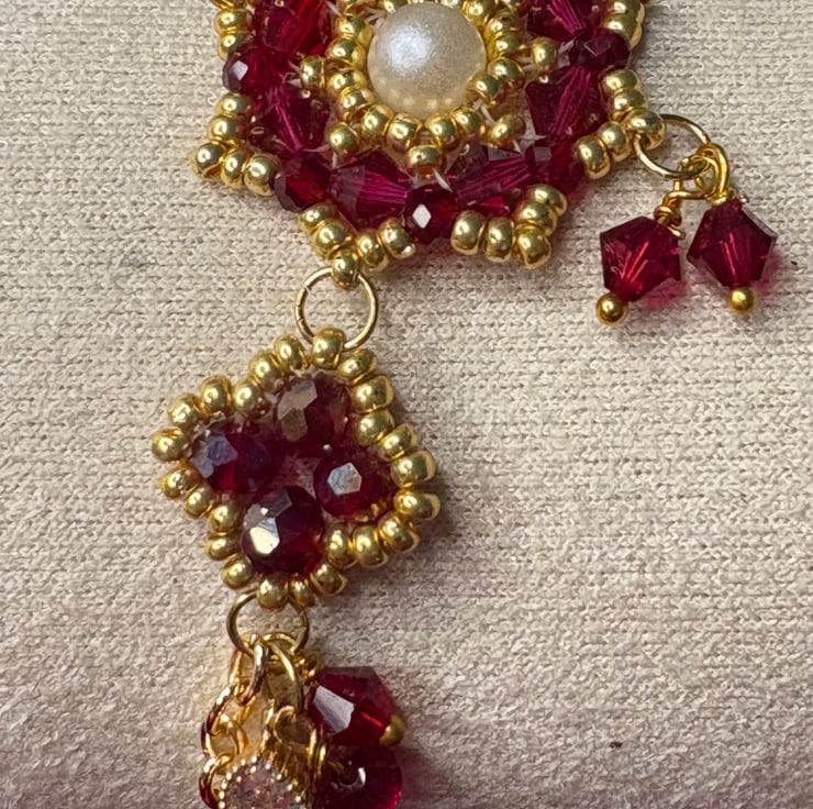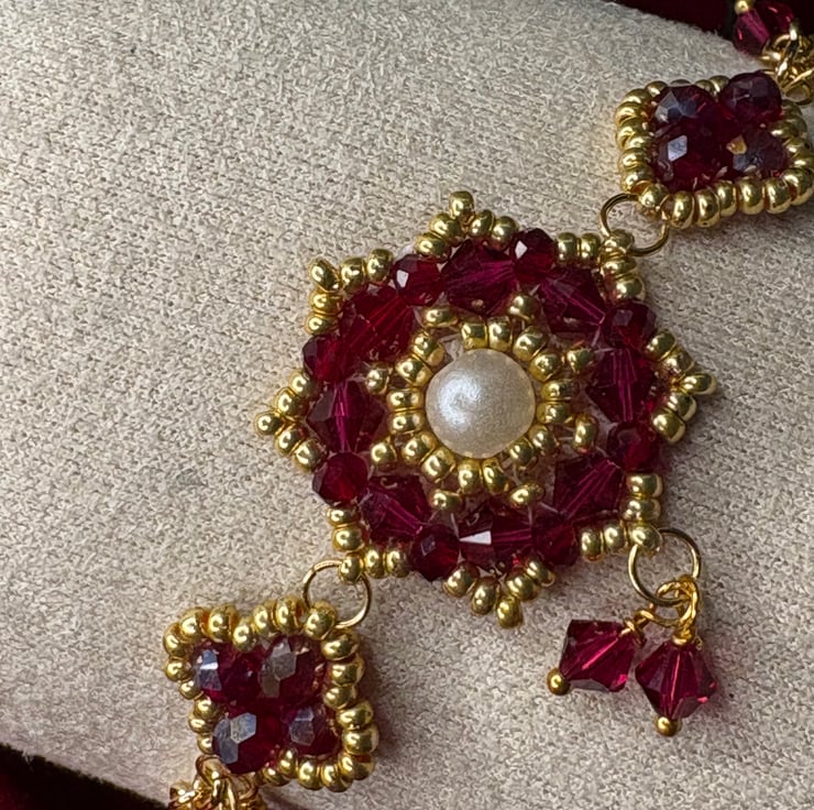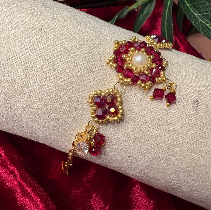 Inspired by the enchanting beauty of the Alhambra in Granada, this bracelet captures the essence of Andalusian craftsmanship and Moorish elegance. Deep red crystals, reminiscent of the rich hue of the pomegranate—Granada’s symbolic fruit—are intricately woven with golden beads, evoking the delicate patterns of the palace’s lanterns. At its heart, a luminous pearl adds a touch of timeless refinement.