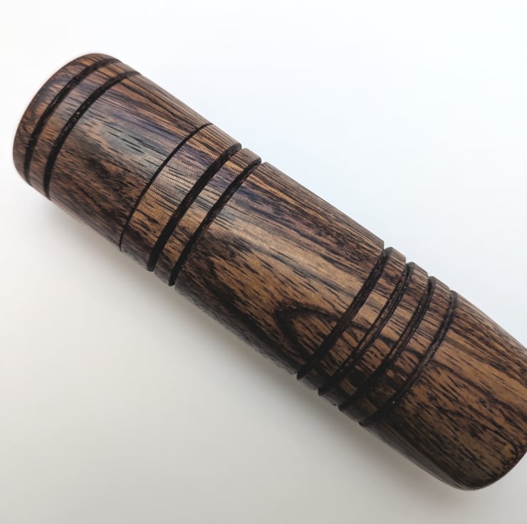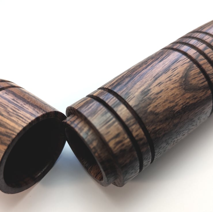 The box is turned from Zebrano and has a striking light and dark brown grain pattern. The lid has a firm suction fit and will not fall off.