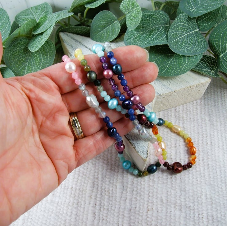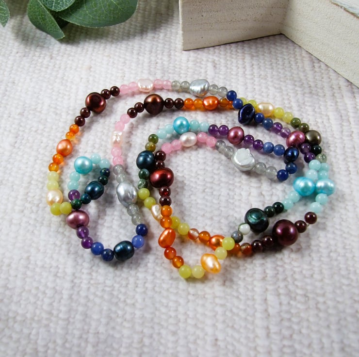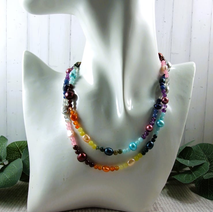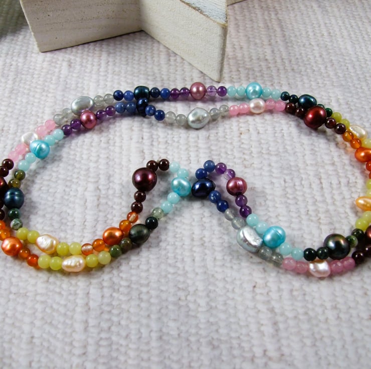 Long Necklace, Rainbow Mixed Pearl and Gemstones.