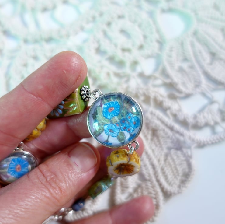 In making is, I used art prints after one of my drawings for two connectors, floral ceramic beads and Czech glass flower beads.