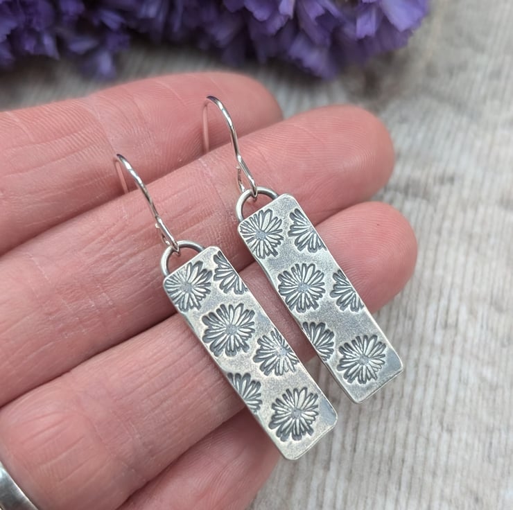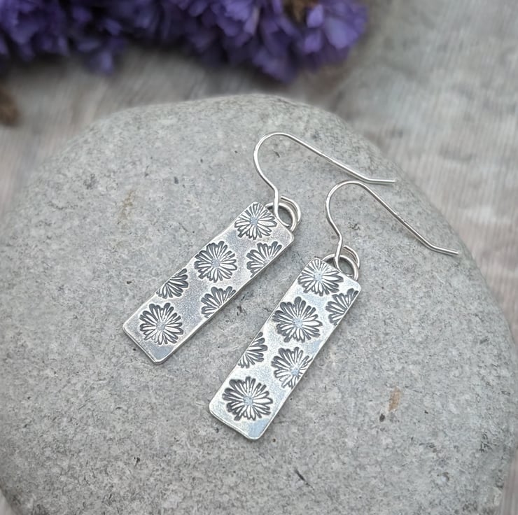 These elegant rectangle earrings are handmade from recycled silver, featuring a delicate daisy pattern that adds a touch of floral charm. The rectangular design is lightweight and comfortable, perfect for everyday wear or dressing up a simple outfit. Each piece is carefully crafted and oxidised to highlight the beautiful floral details. These earrings are a lovely choice for anyone who appreciates sustainable jewellery with a unique, handmade touch.
