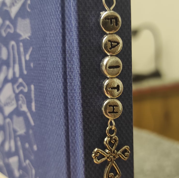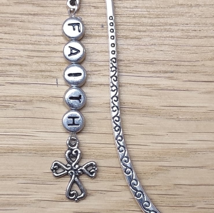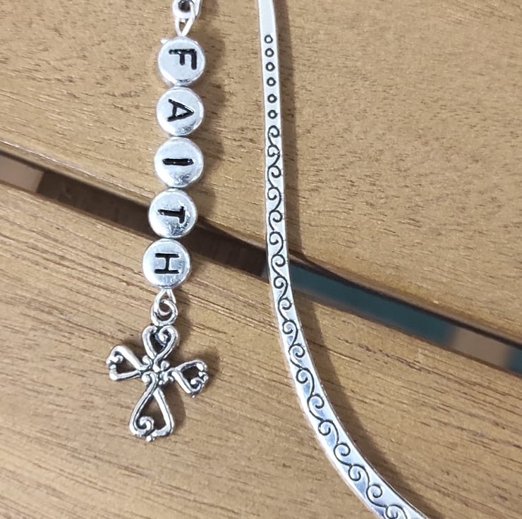 Scroll bookmark with a dangle containing the word FAITH and a crucifix charm. All items are silver plate.