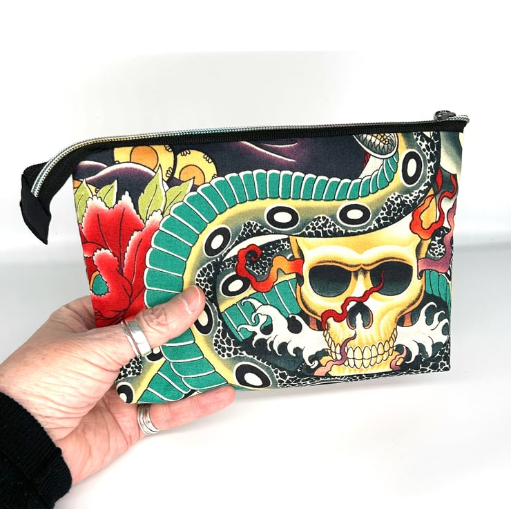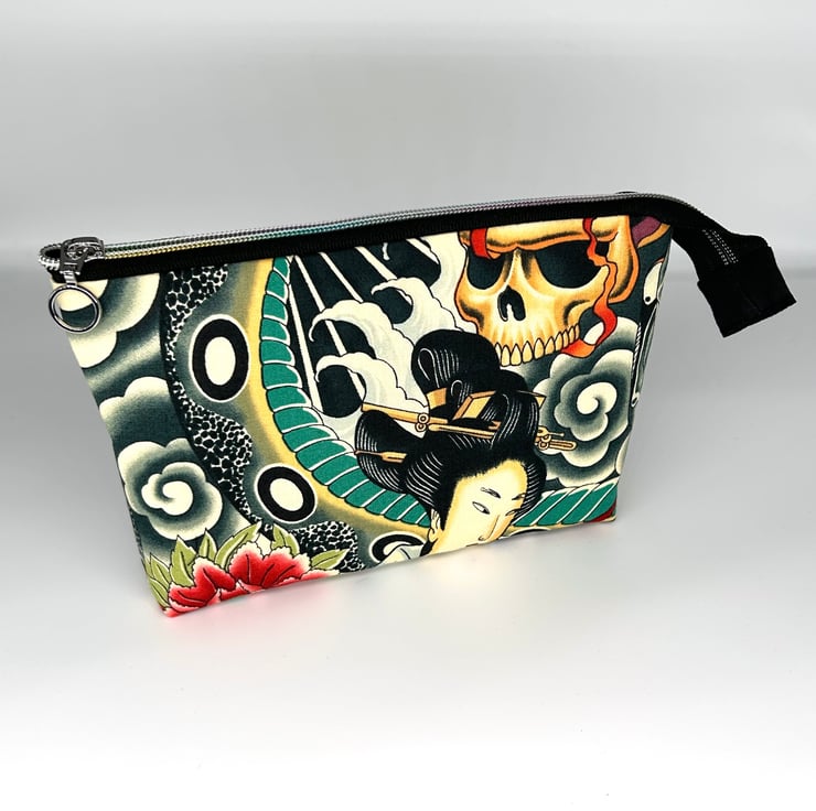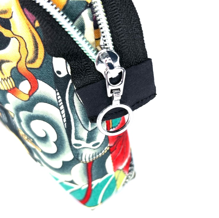 This make up bag has tattoo style print with roses on and is quality 100% cotton. It has a black 100% cotton lining. The zipper is black with coloured teeth and a round zipper pull.