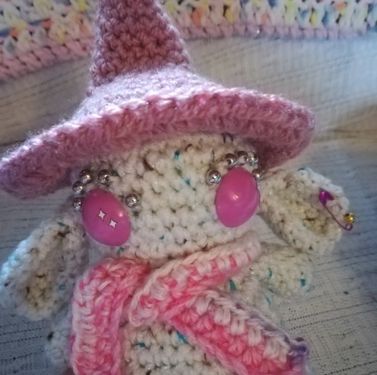 She has a pretty pink hat and a lovely scarf, pale pink eyes with a bit of magic... And she even makes a magical sound when you shake her.