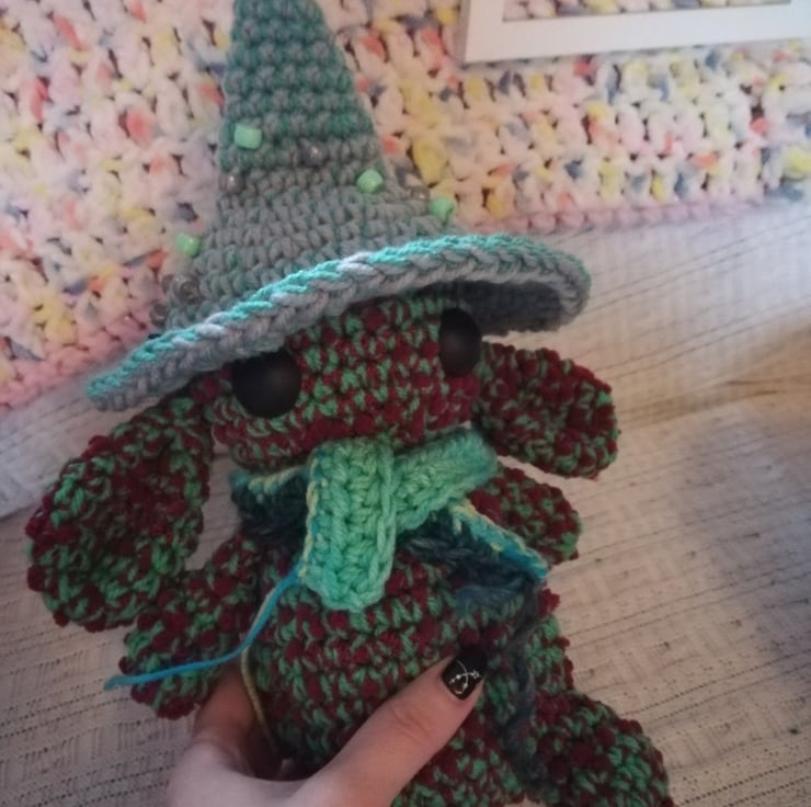 He's wearing a lovely big hats with some magical beads that stitched on. And lots of other little details that make him a perfect companion for your desk.