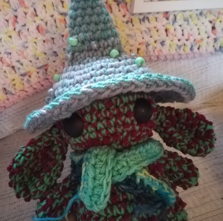 This magical goblin is made from variegated yarn to give it an extra mossy Forest look.