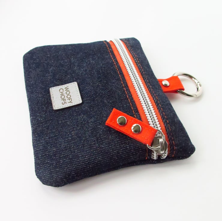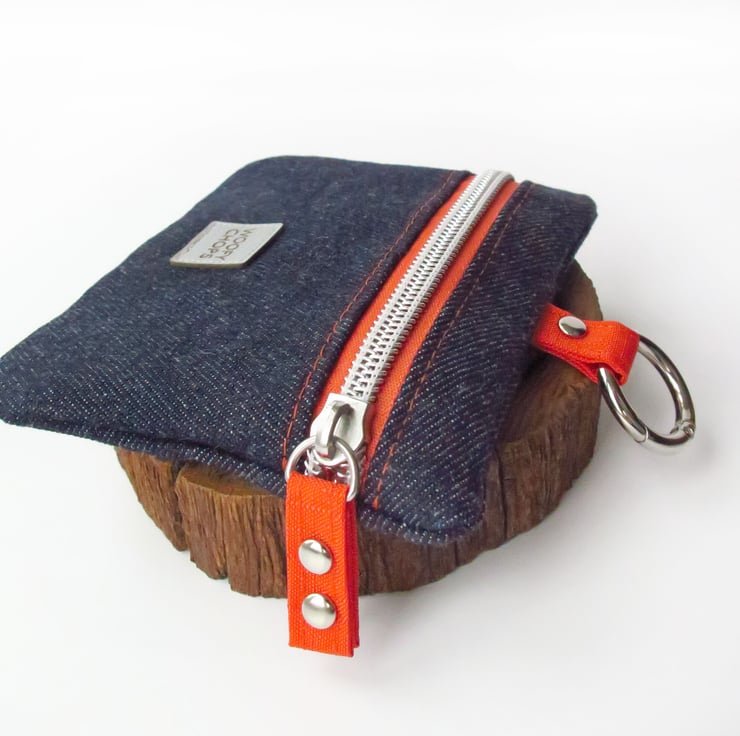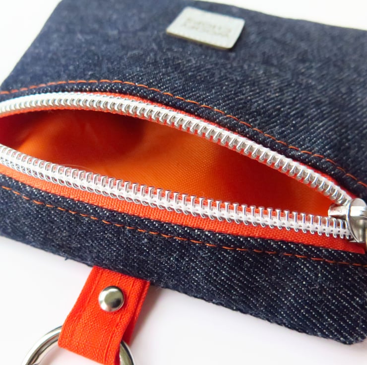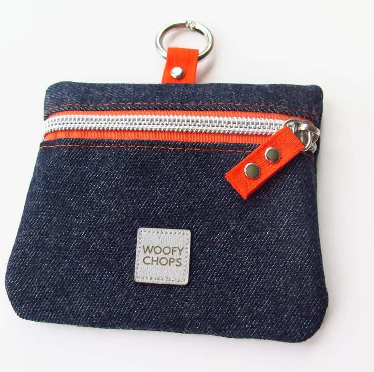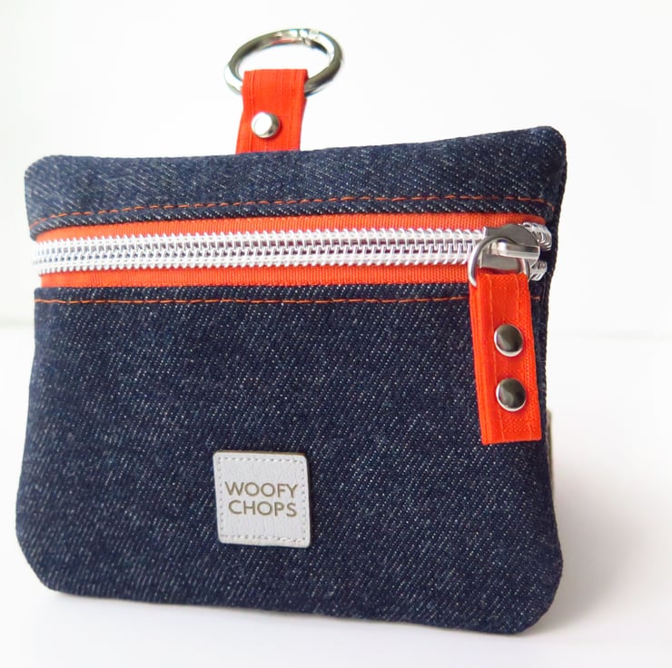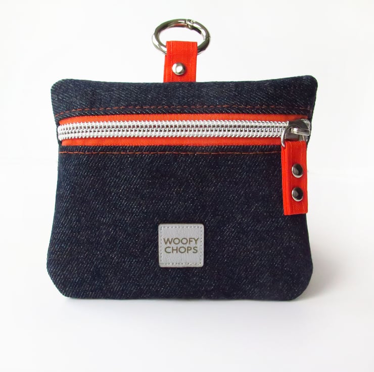 This treat bag is made from a navy blue Demin fabric with an orange rip stop liner inside, with orange zip pull and top tab. The exterior denim fabric is not waterproof.