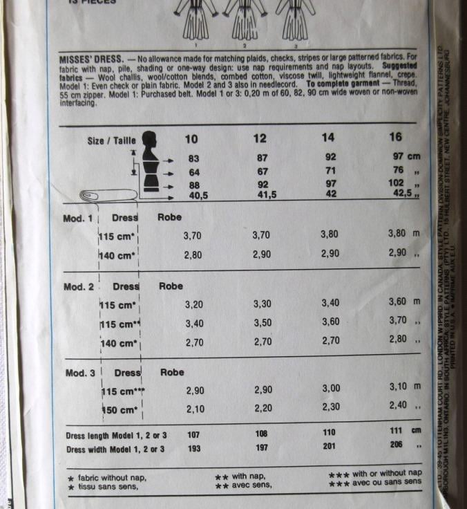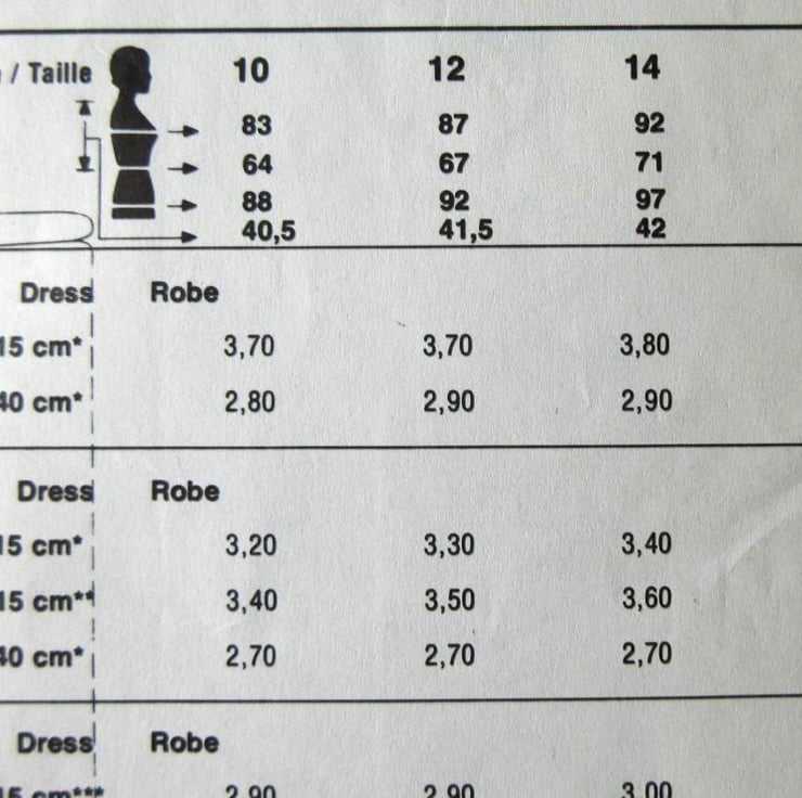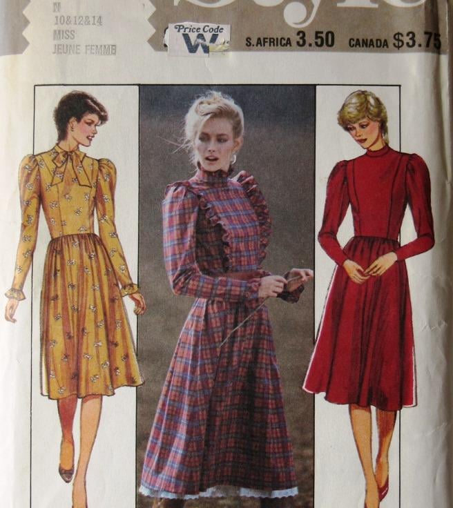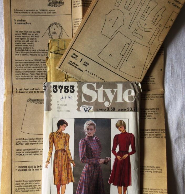 A multi-size sewing pattern for a misses' long-sleeved dress in sizes 10 - 12 - 14 (32.5"/83 cm - 34"/87 cm - 36"/92 cm, Style 3753). The long-sleeved dress has skirt gathered on to fitted bodice with princess seams, back zipper fastening and puffed sleeves. View 1 has neck ruffles and ruffles on bodice seams and cuffs. View 2 has bow collar, and view 3 has stand collar. The pattern has been used to make size 14, so all sizes are still useable. All pattern pieces have been used apart from the collar ruffle and the collar for view 2. The envelope flap is missing.