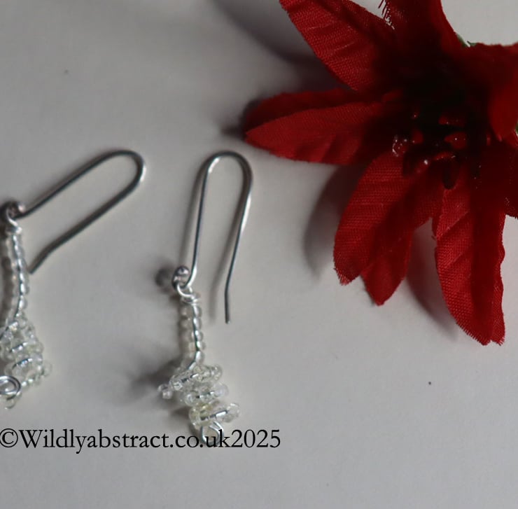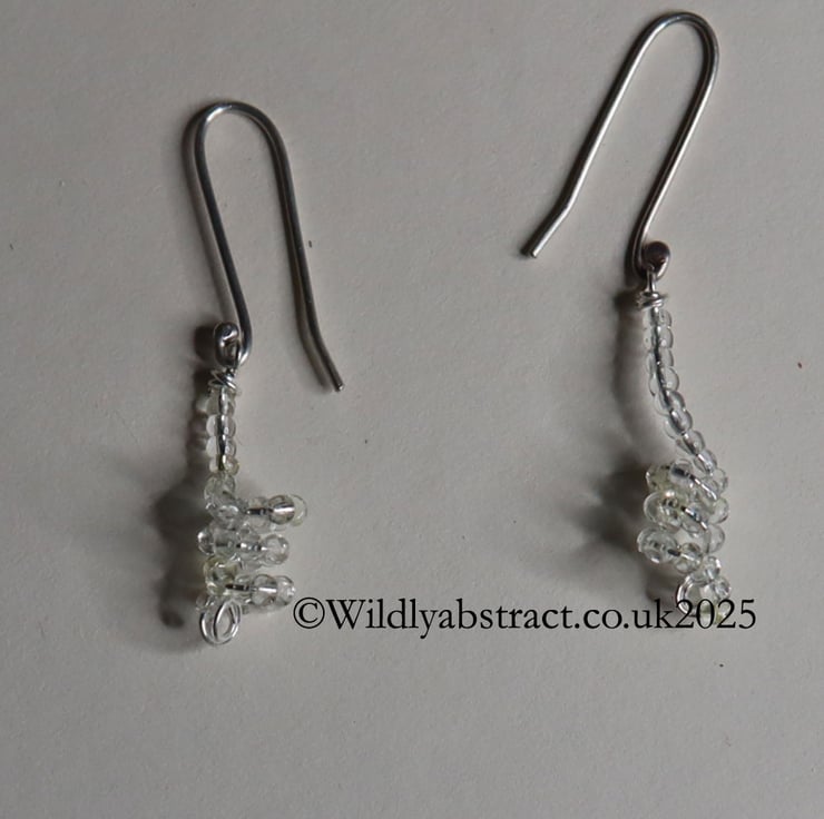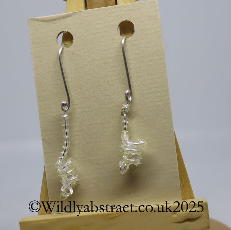 This unusual earrings were created by threading clear glass seed beads onto fine silver wire which was then coiled and fired in the kiln to fuse the seed beads to the wire. It is an exciting process. The earrings are suspended from a hand-formed sterling silver ear wire. They measure 3cms long with a drop length of 4cms.