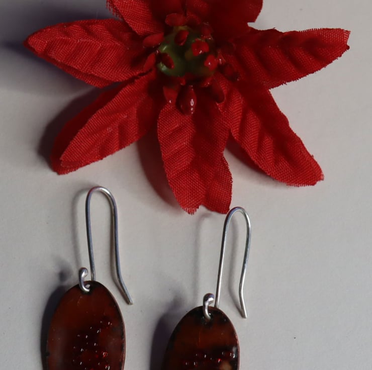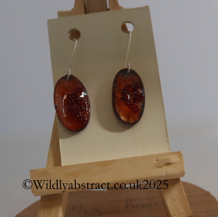 Handcrafted from hand-pierced copper sheet into an oval shape, these earrings were coated with a base layer of orange transparent enamel and decorated with glass seed beads. They were then fired in the kiln to fuse the enamel to the base metal. The earrings are suspended from hand-formed sterling silver ear wires. They measure 1.5cms x 1cms with a drop length of 3cms.