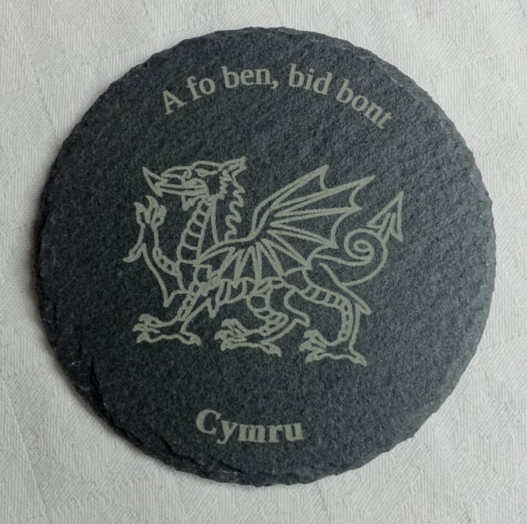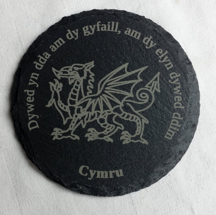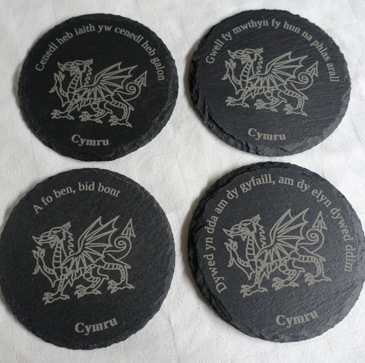 Set of 4 natural slate coasters. Each is engraved with a dragon and a different piece of Welsh wisdom;