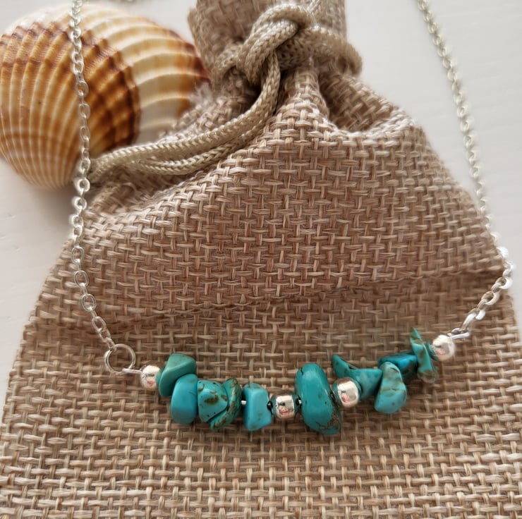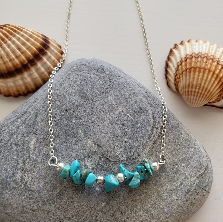This handmade turquoise blue chip stone necklace is unique as every stone is shaped and coloured differently.