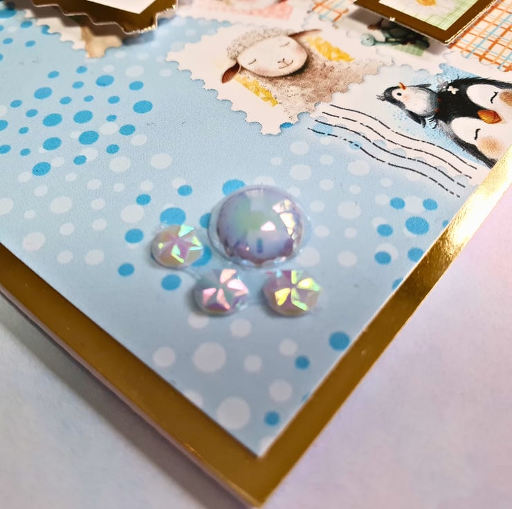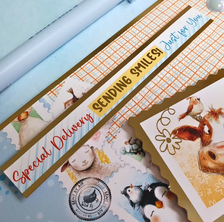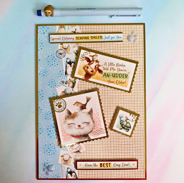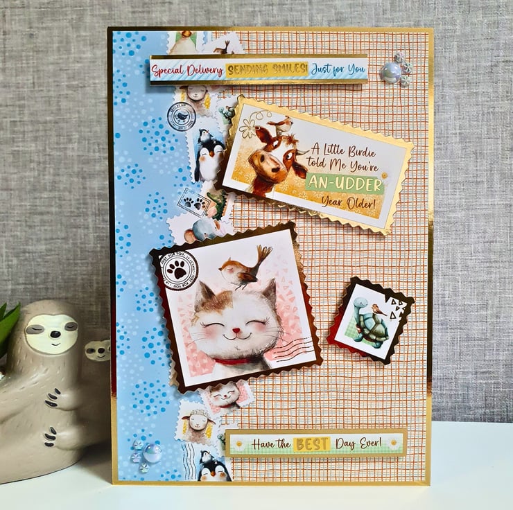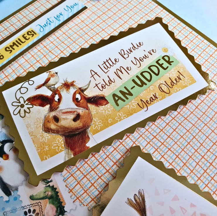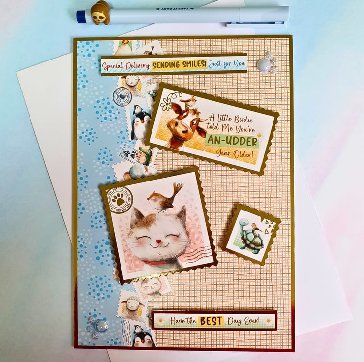 The Cow topper reads the humoristic sentiment "A Little Birdie Told Me You're An-Udder Year Older" and is accompanied by a cat and a turtle toppers both with little birds with them! Two sentiment strips are on top & bottom of the card, reading "Special Delivery, Sending Smiles!, Just For You" & "Have The Best Day Ever!". All elements are raised with foam pads on an animal printed card with a plaid pattern & layered on a gold mirror card. It is embellished with coordinating craft gemstones & finished with a matching insert that has been stamped with the sentiment "It's Your Birthday" in brown, still leaving you plenty of space for messages and wishes!