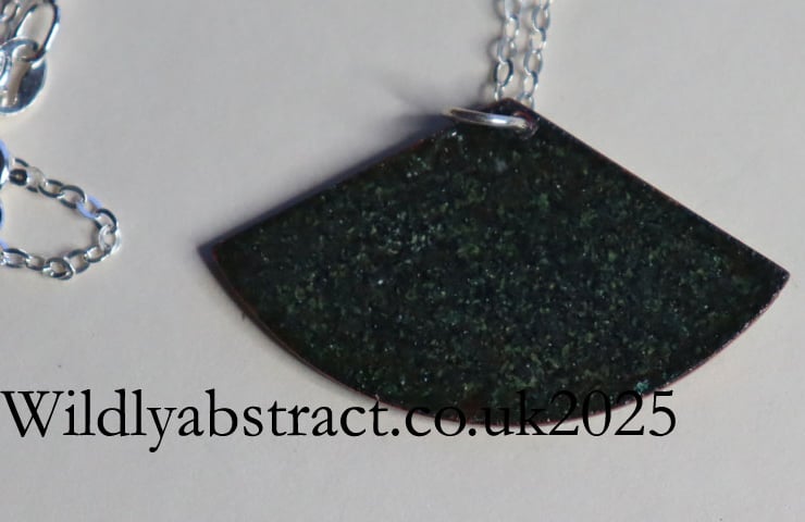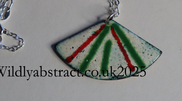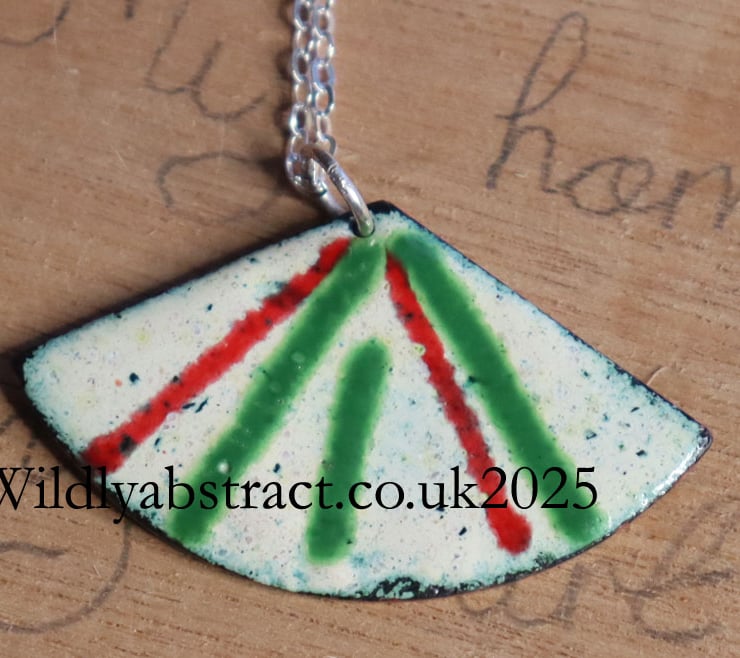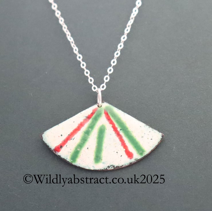 Handcrafted from copper sheet, this pendant was hand-pierced into a fan shape, coated with a base layer of white enamel and decorated with enamel threads. The pendant is counter-enamelled on the reverse. It is suspended from a sterling silver trace chain and measures 3cms x 2cms with a total length of 25cms.