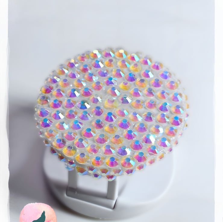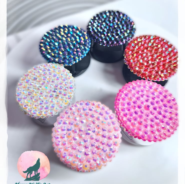 The pop-socket has been blinged out with reflective resin AB Transparent rhinestones.