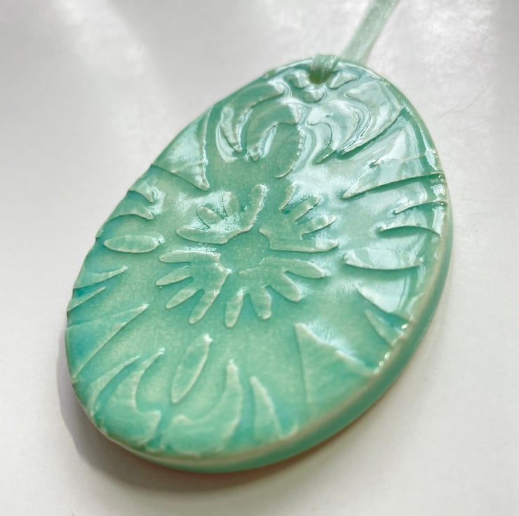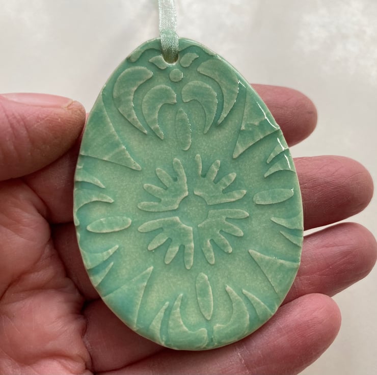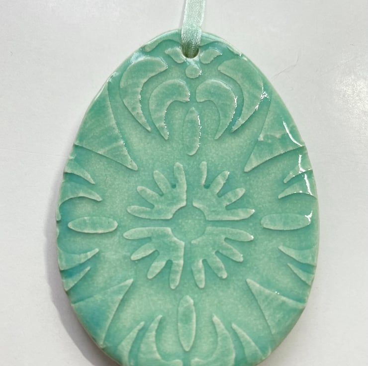 This little ceramic easter egg is made from white earthenware with a raised pattern. This has been fired in an electric pottery kiln, so it is nice and strong. It measures 6.5cm x 4.5cm and hangs from a matching cream organza ribbon. It is glazed on the front and left plain on the back. It is imperfect because it has slightly warped in the firing process but looks fine when hung up!