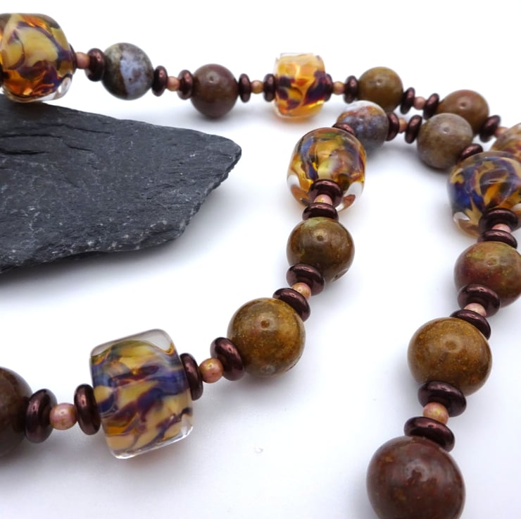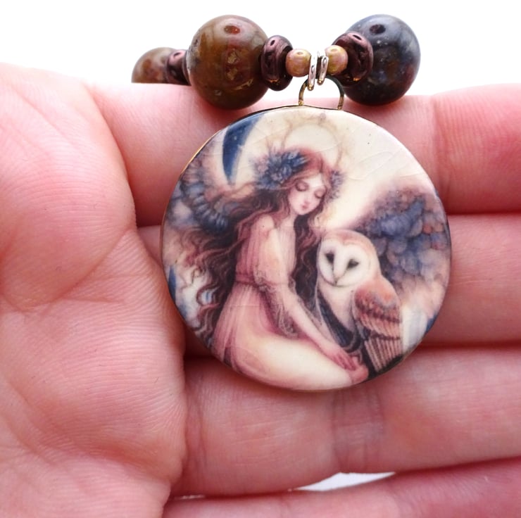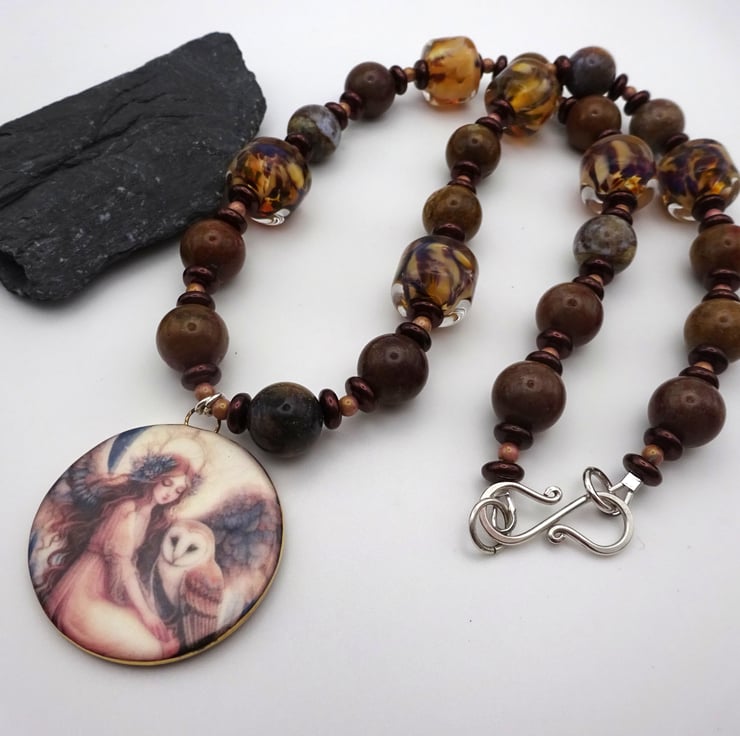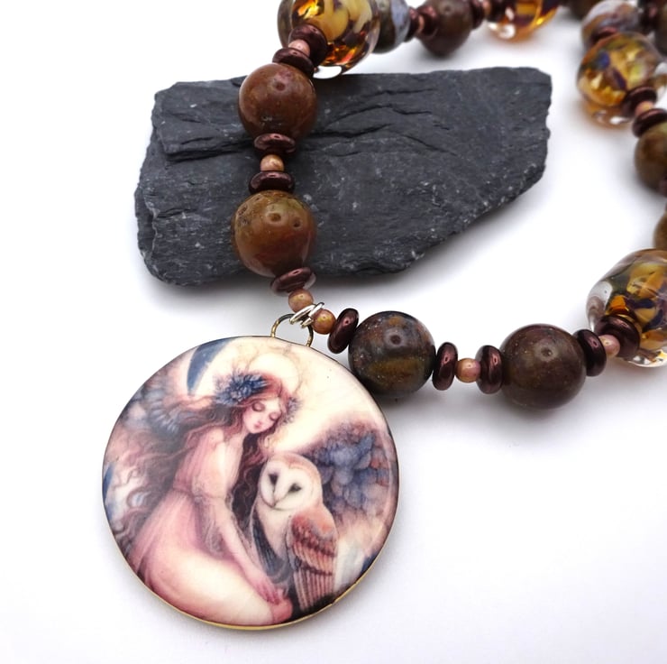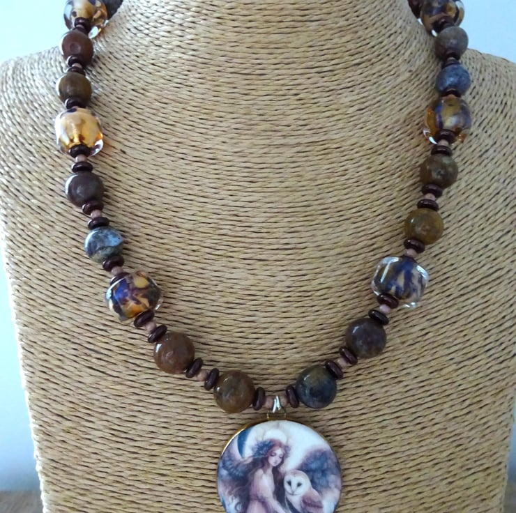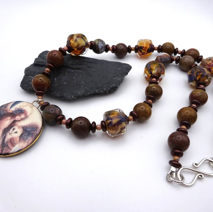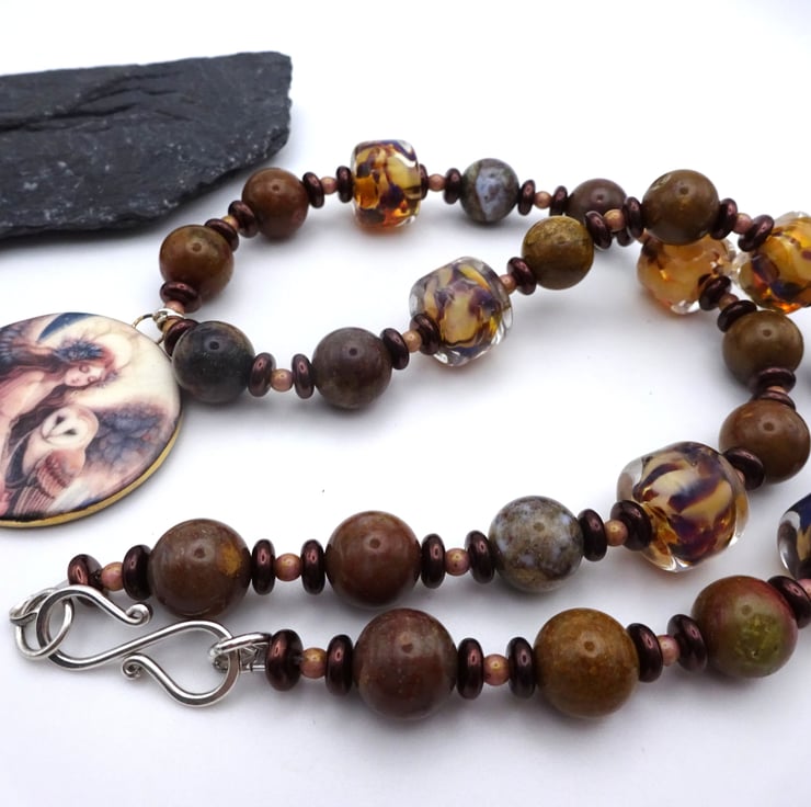 A necklace made with handmade lampwork glass brown speckled beads, Czech glass beads and jasper gemstone beads. The necklace has a handmade ceramic pendant with the image of an angel and an owl.