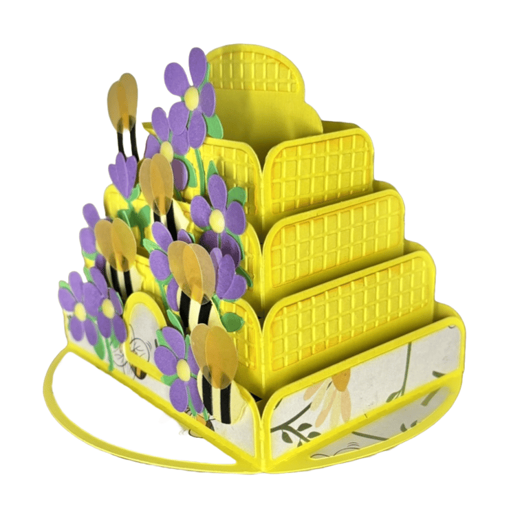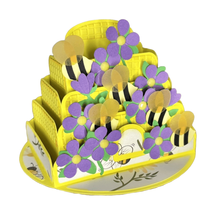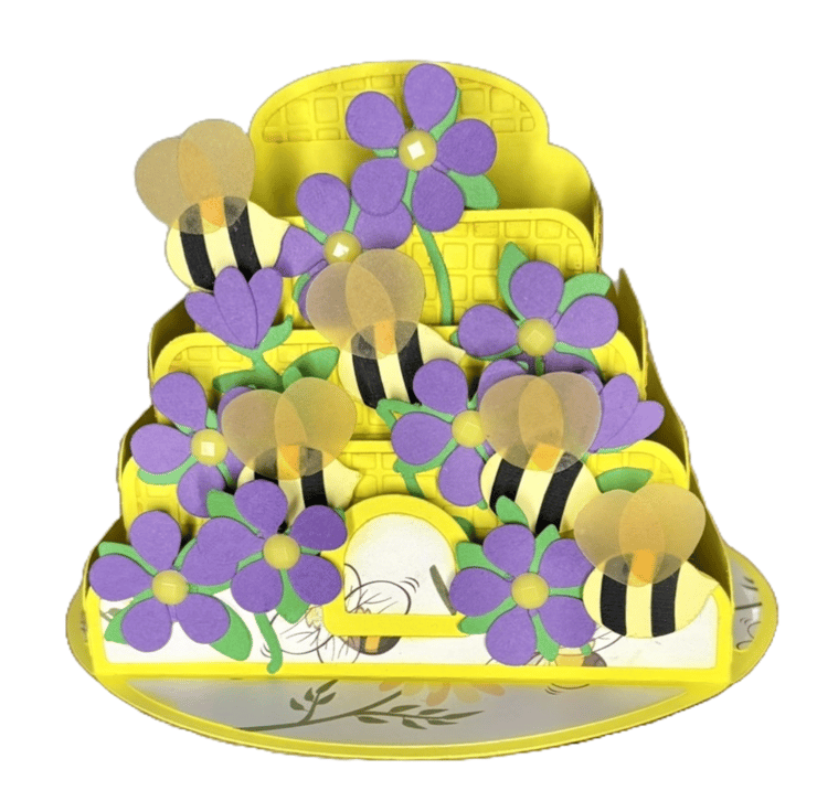 This vibrant card features a yellow beehive with a detailed honeycomb pattern. Inside, purple flowers with yellow centers and lush green leaves create a burst of color. Playful bees with striped bodies and translucent wings buzz among the flowers. The honeycomb background and green foliage patterns on the circular base add texture and depth.
