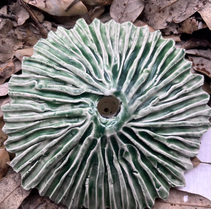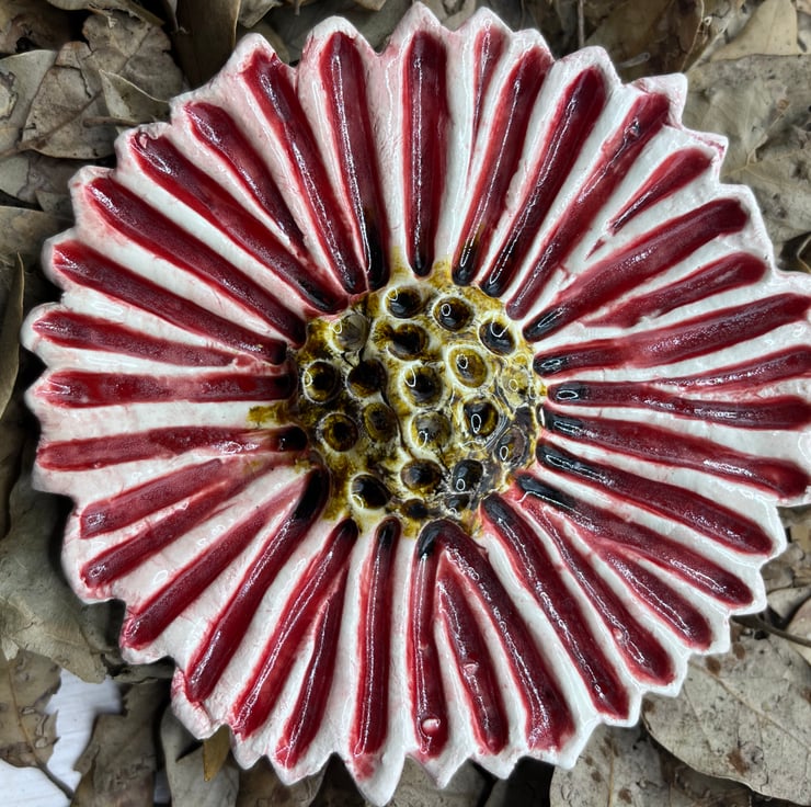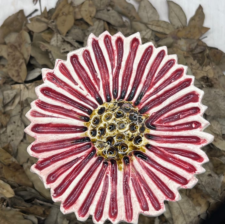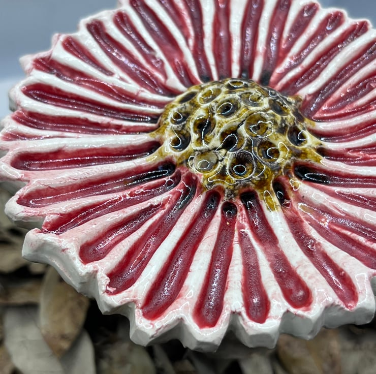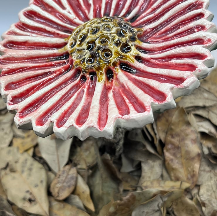 Ceramic sunflower cane topper made in white clay and fired to 1060c …red and green glaze …approximately 115mm diameter by 45mm deep …8/9mm hole in the base for a cane (not supplied)…can be placed in or outside but please remember it’s not frost proof…thank you for looking…JK12