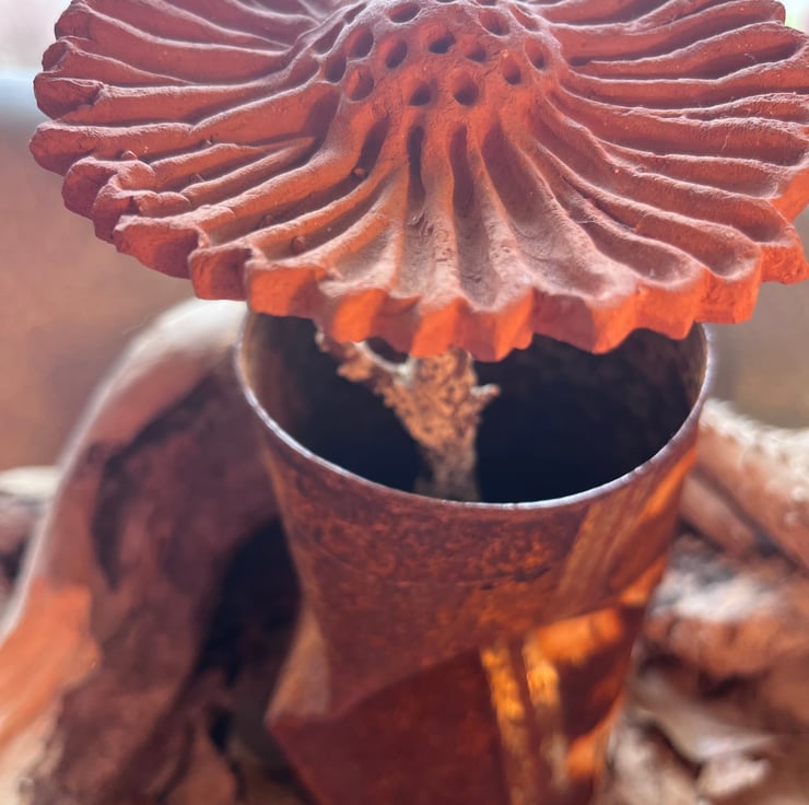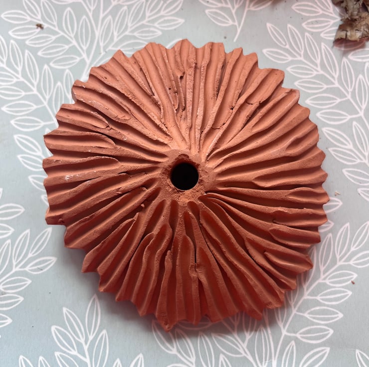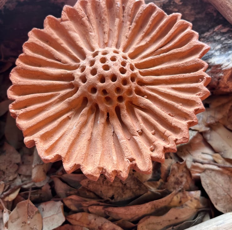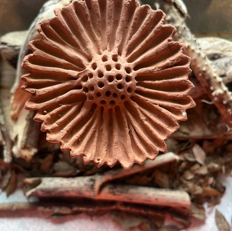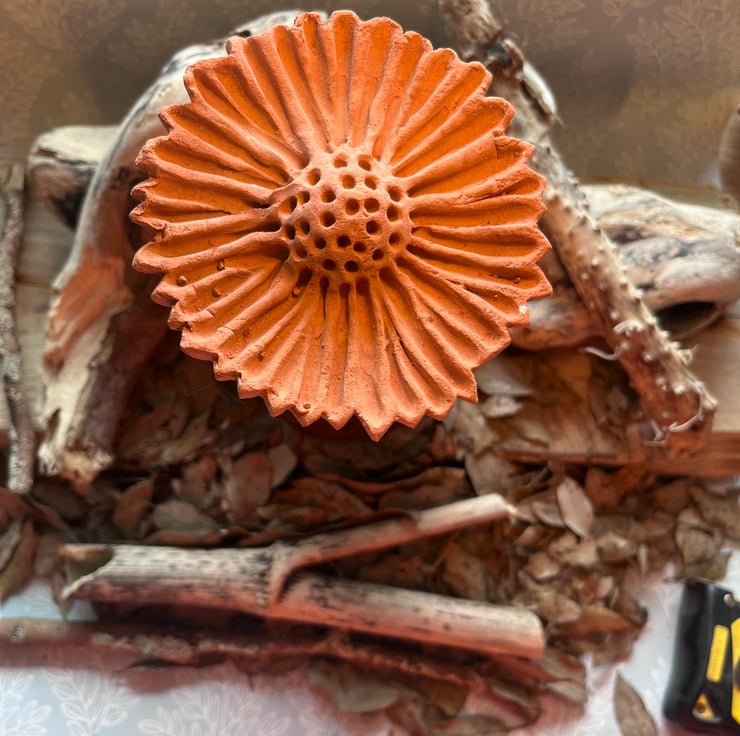 Terracotta sunflower cane topper fired to 1060c …approximately 115 diameter and 45mm deep …8/9mm hole in base for a cane (not supplied)….would look good indoors amongst other plants/flowers or outside in the garden but please remember it’s not frost proof…thank you for looking …JK9