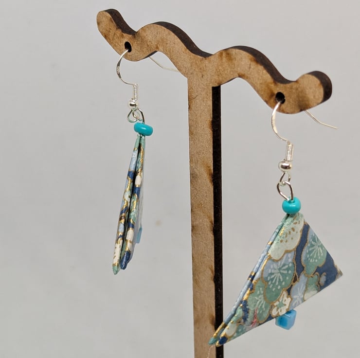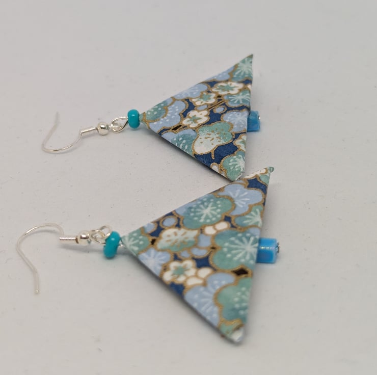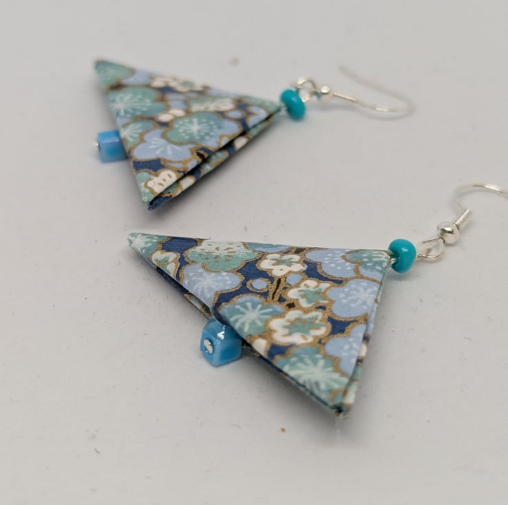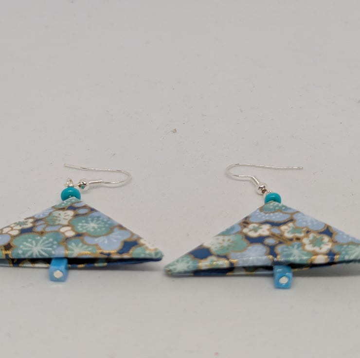 These unique earrings have been created with traditional Japanese washi paper with an elegant pattern of plum tree flowers in white and blue, on a turquoise background. The paper has been folded using origami techniques with the addition of small beads in a complementary shade of blue to create earrings which are 3cm in length, with sterling silver ear hooks. Hand crafted and designed in Glasgow, Scotland, these earrings would be a great addition to any collection. A perfect and unique choice for a first wedding anniversary gift!