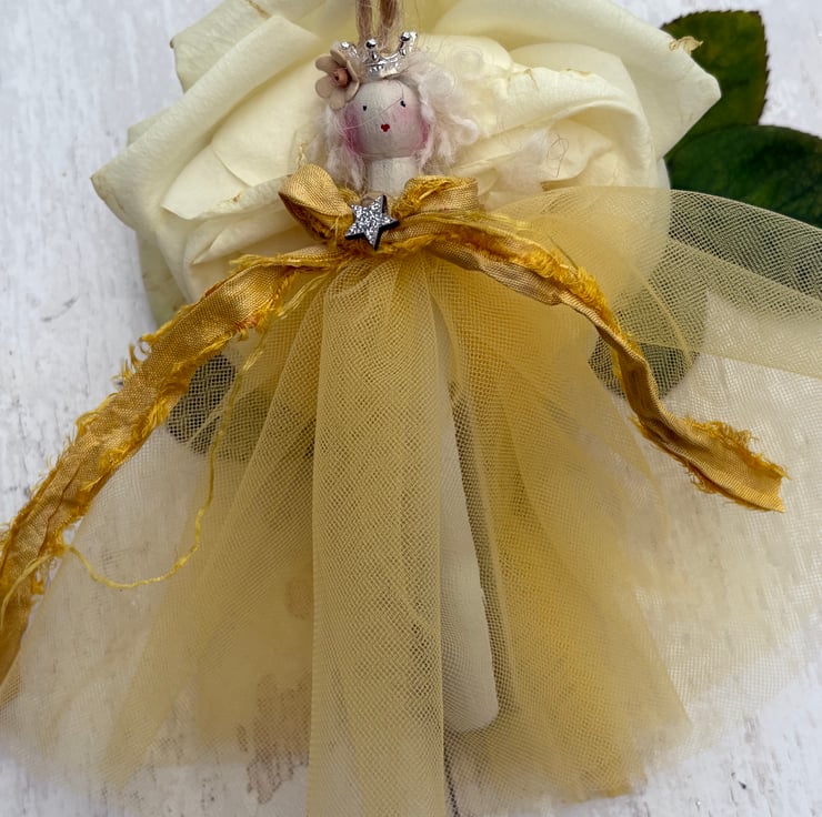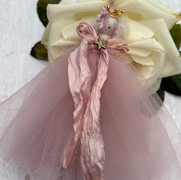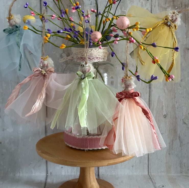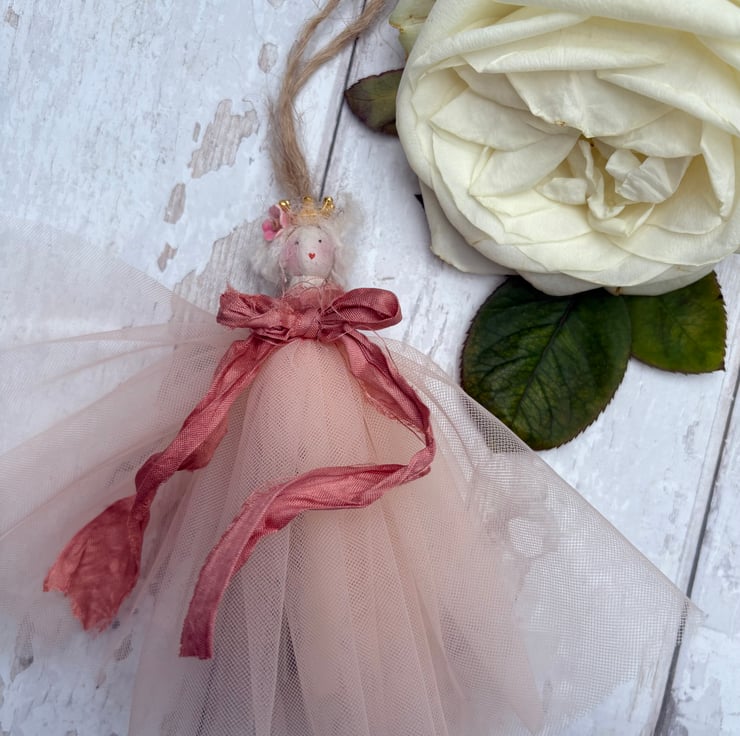Hand painted beech wood dolly peg using Jubilee fine paint and dressed in hand sewn fine pastel tulle and vintage silk ribbons. Each princess has a jute string loop for hanging. sentiment tags can be added to make your doll more personal. Available to buy as individual pieces or as a set.