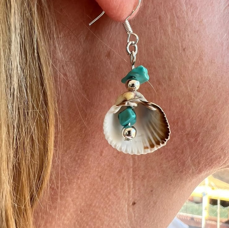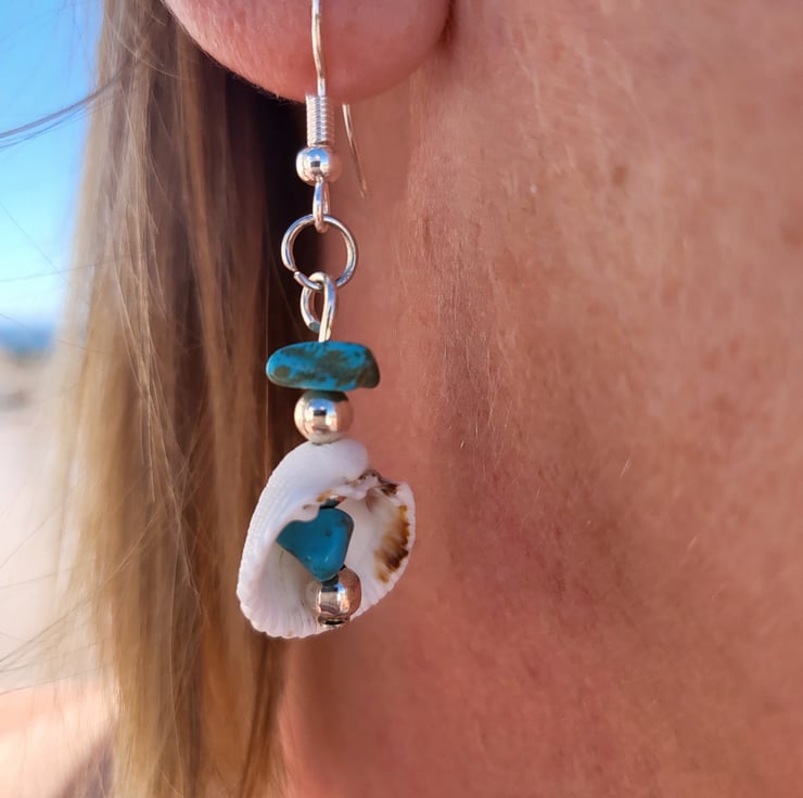 Natural sea shell earrings with unique turquoise chip stones enhanced with silver plated beads.