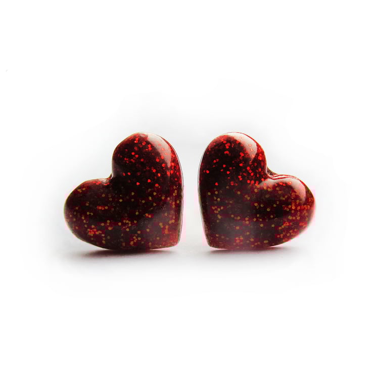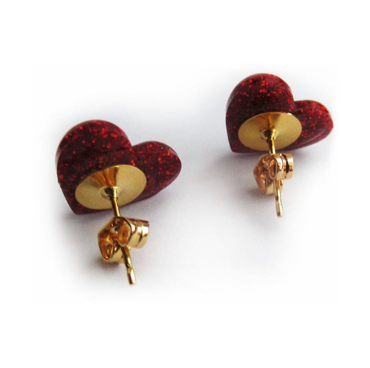 These are handmade Red Glitter Resin Heart Stud Earrings.Made with UV Resin the Heart Shape measures approximately 15mm across and the earring posts are approximately 10mm long.The Earring Posts and Scrolls are made of Brass with a Gold Plated Finish.