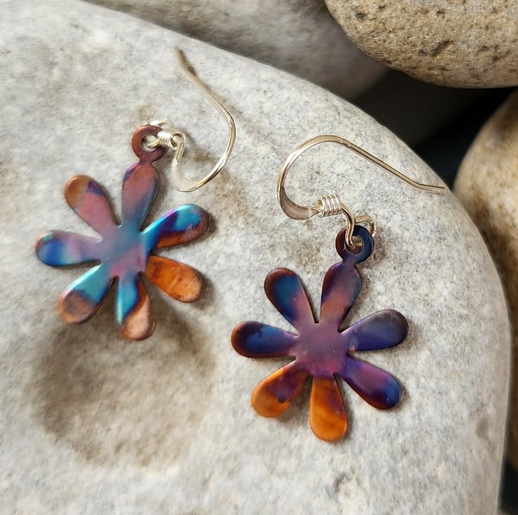 These copper flower shaped earrings are approximately 1.5cms across. Sterling silver ear wires. They have been flame painted. This is a technique that produces one-of-a-kind effects as you can see, the pattern will not be replicated. It is done with a micro torch producing different hues of yellow, green, pink, purple, blue with each firing. The shapes are matching but the colouring cannot be so.