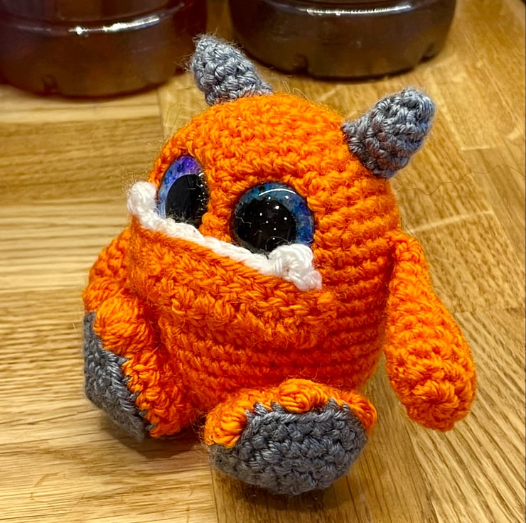 He is hand crocheted by myself using an orange acrylic yarn with grey horns and feet. He has gorgeous blue iridescent eyes. He sits at just 7.5cm tall, a perfect size to pop in your pocket: