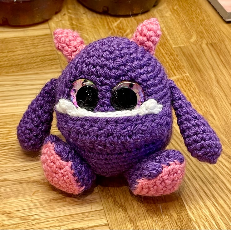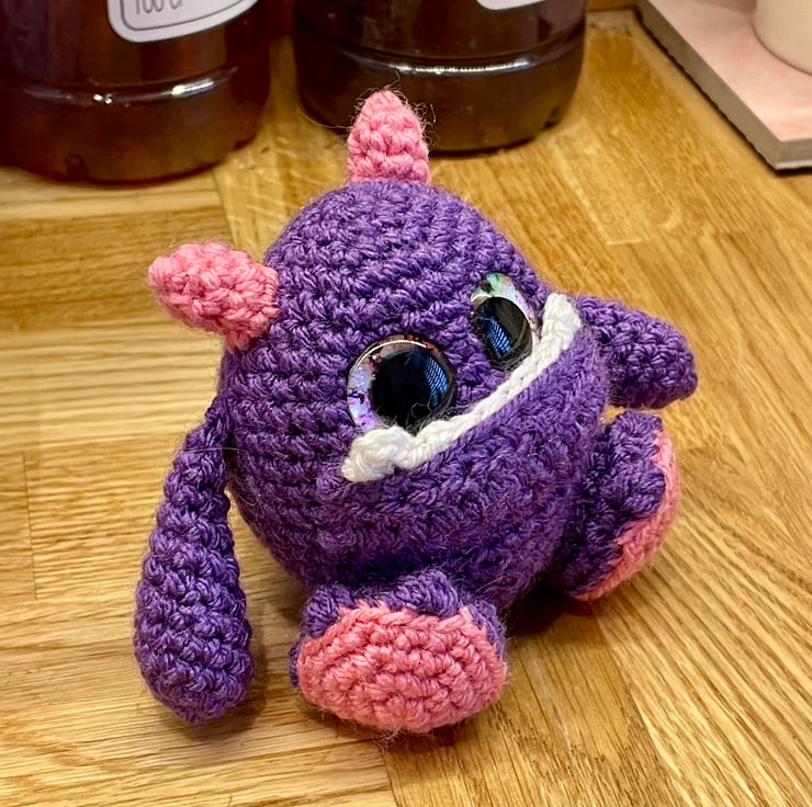 He is hand crocheted by myself using a purple acrylic yarn with pink horns and feet. He has gorgeous pink iridescent eyes. He sits at just 7:5cm tall, the perfect size to fit in your pocket.