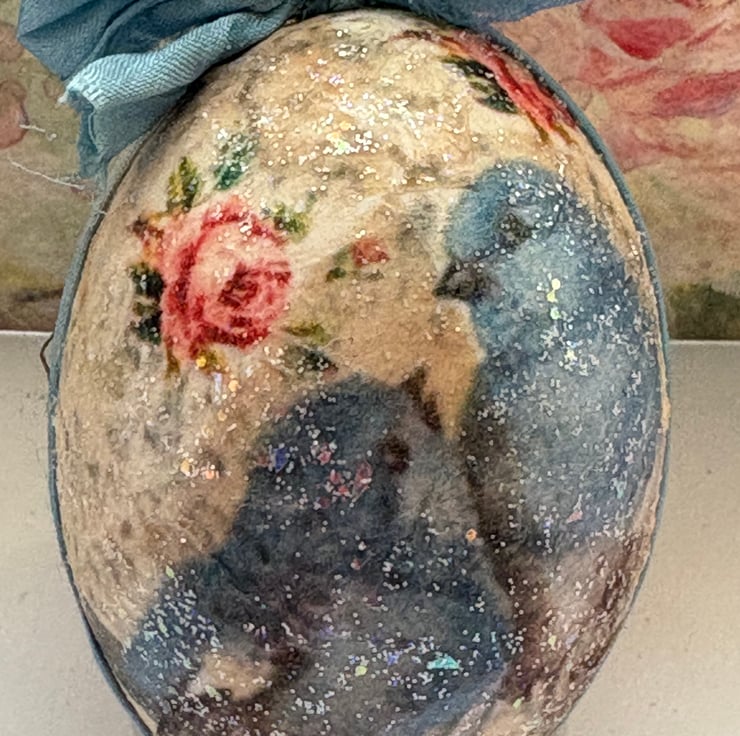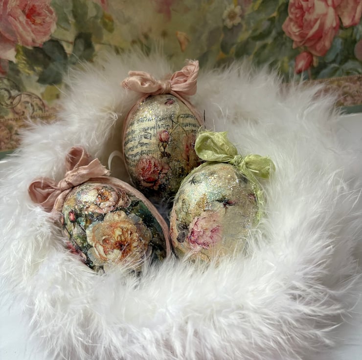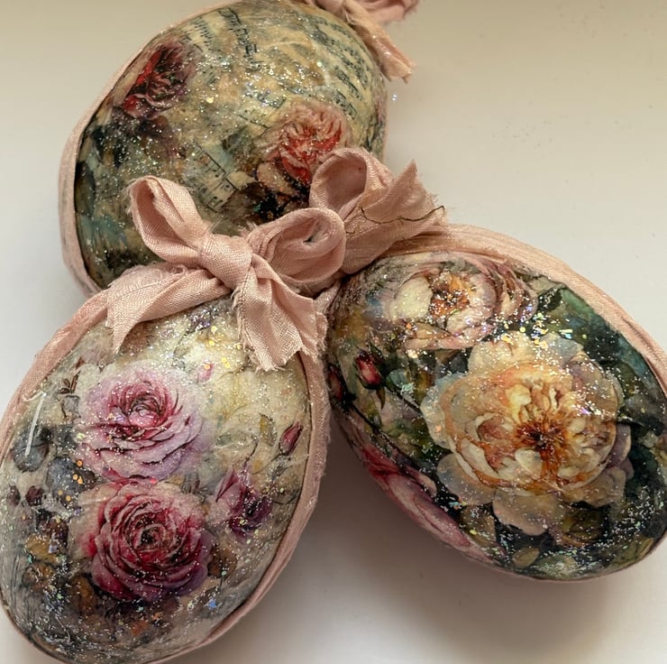 Decoupaged wooden eggs, the size of a hens egg approximatley 6cm or 2.5in. each egg is covered in a vintage style floral design and is decorated with a hand dyed vintage silk ribbon and finished with a sparkly mica gel. Available in three colour ways antique pink, a vintage cerulean blue and soft green the colour refers to th ribbon not the image. These look very pretty when displayed together.