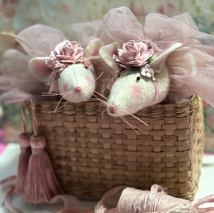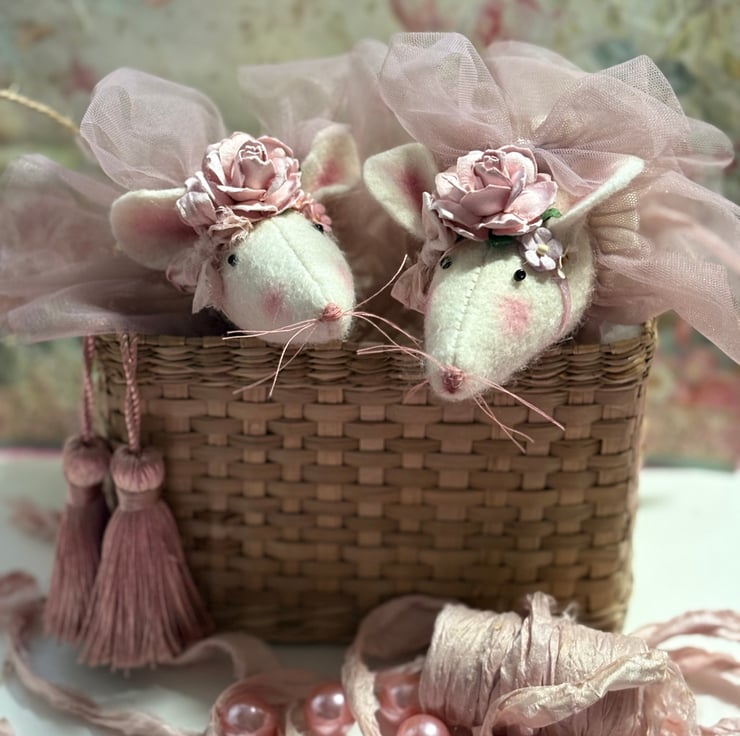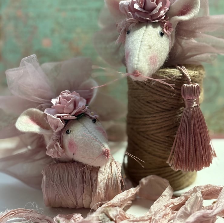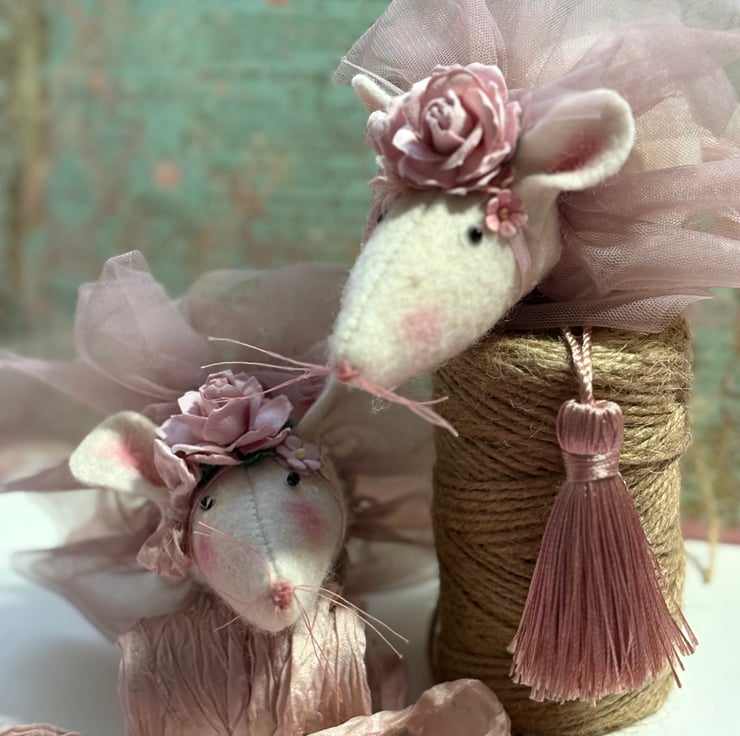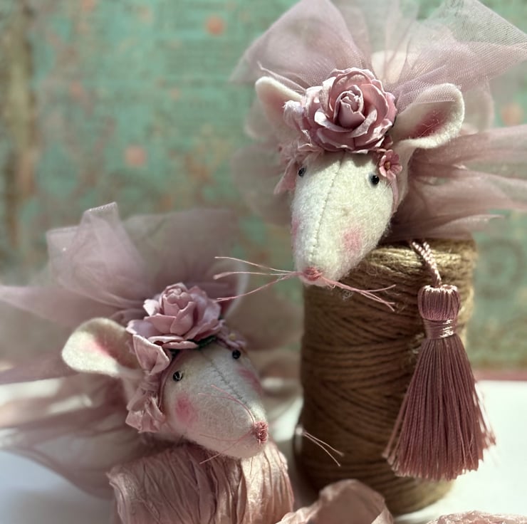 Ballerina mouse wearing a pretty pink tutu and has a flower crown, she is approximately 15cm /6inches long not including her tail. she has a hand stitched nose and lovely pink cotton whiskers. her eyes are tint glass beads which are glued into place.Ballerina mouse has lots of ruffles and bows and is a very fancy mouse. Her tutu is a an antique pink coloured tulle and her flowers are made from mulberry paper.