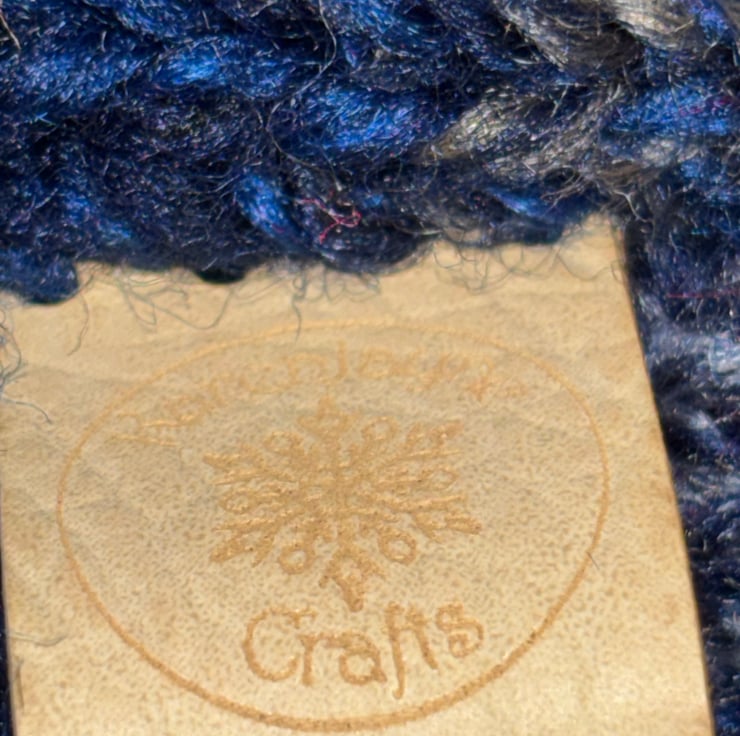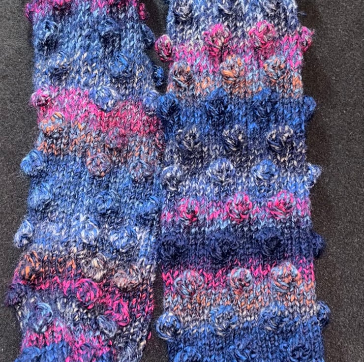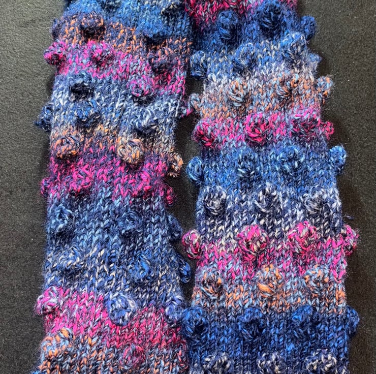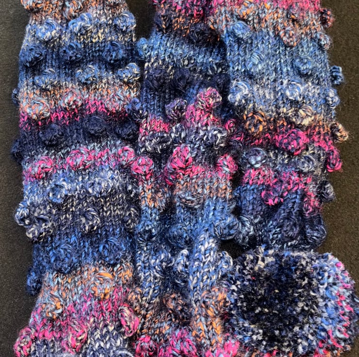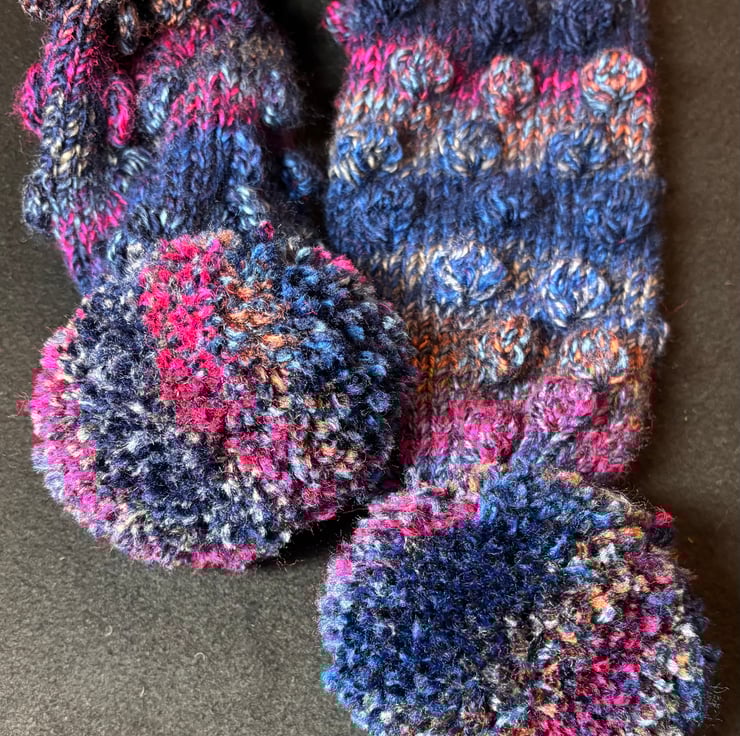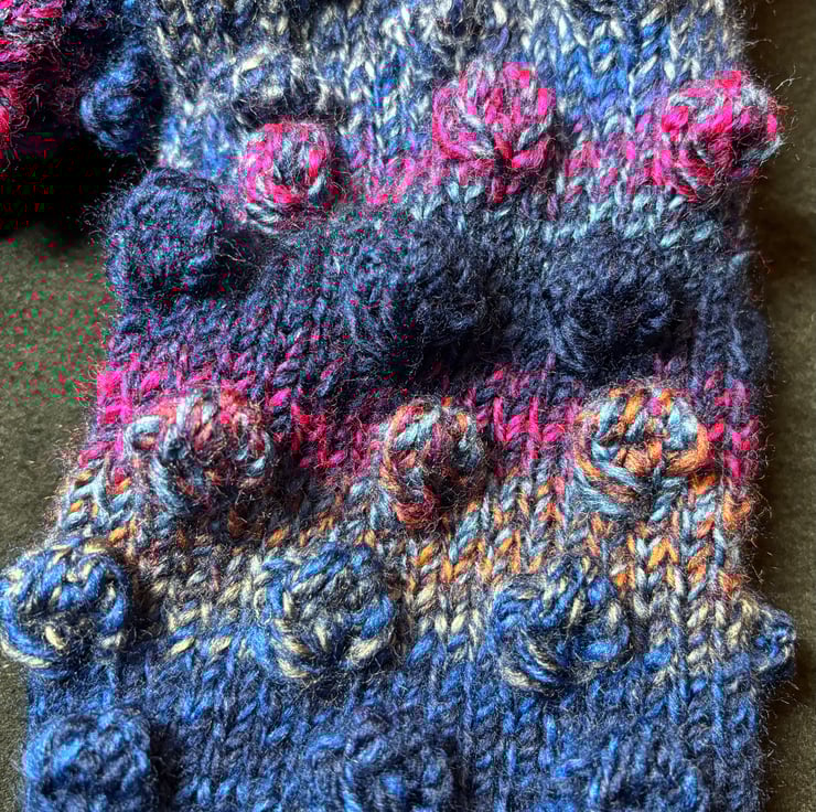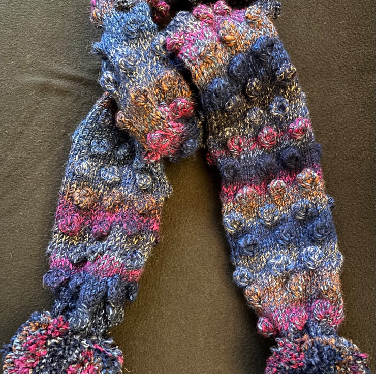 A hand knitted chunky bobble scarf knitted in James Brett Marble Chunky. Scarf measures approximately 160cm and is finished with a large pom pom on each end. Scarf is dark blue with pink, orange and grey tones. Scarf is darker in shades than photo’s depict.