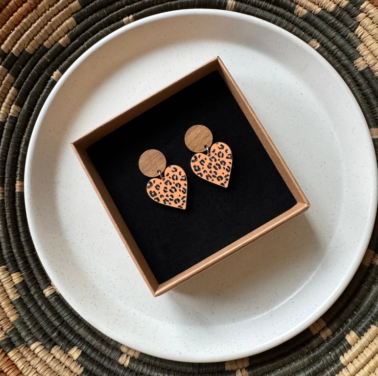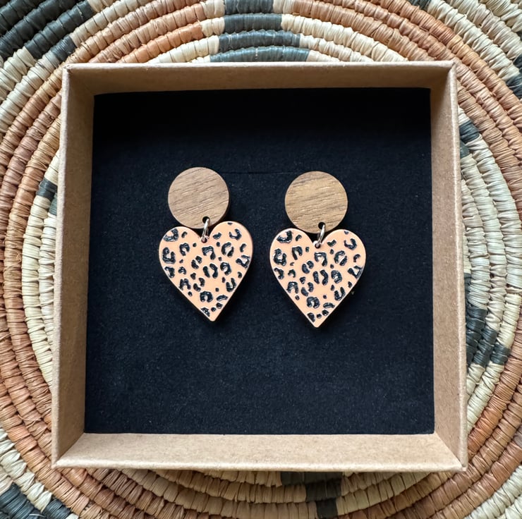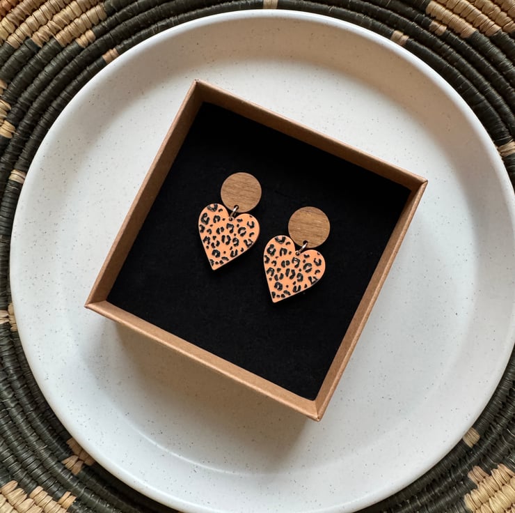 Walnut & Pastel Peach Acrylic Heart Earrings – Leopard Print Engraved